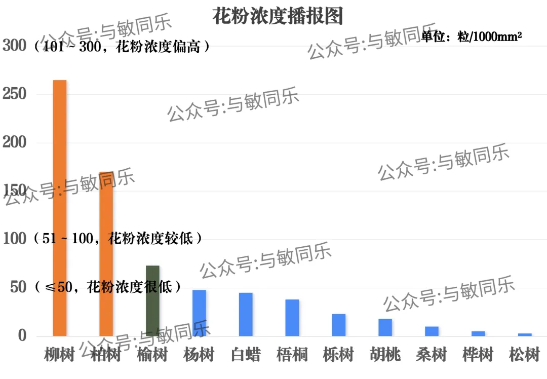 柳树、柏树花粉浓度为偏高;榆树花粉浓度为较低;