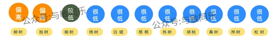 杨树、白蜡、梧桐、栎树、胡桃、桑树、桦树、松树花粉浓度为很低。