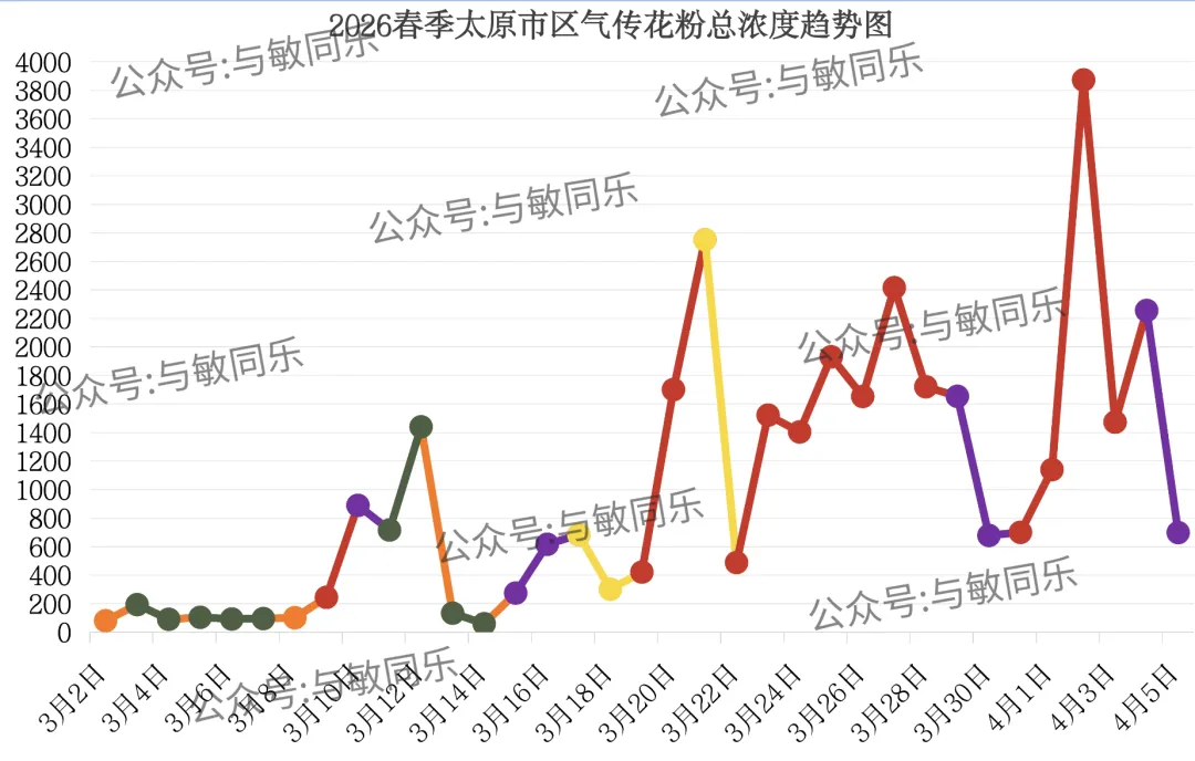 4月5日早8点至4月6日早8点:花粉总数在501~800(粒/1000mm²)之间,花粉总浓度为五级(花粉浓度很高)。