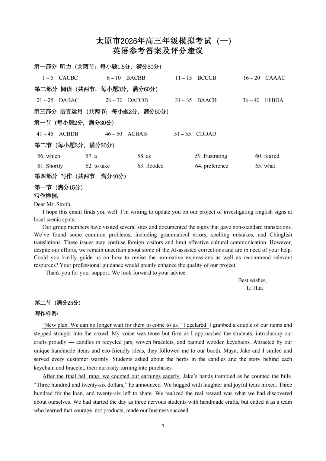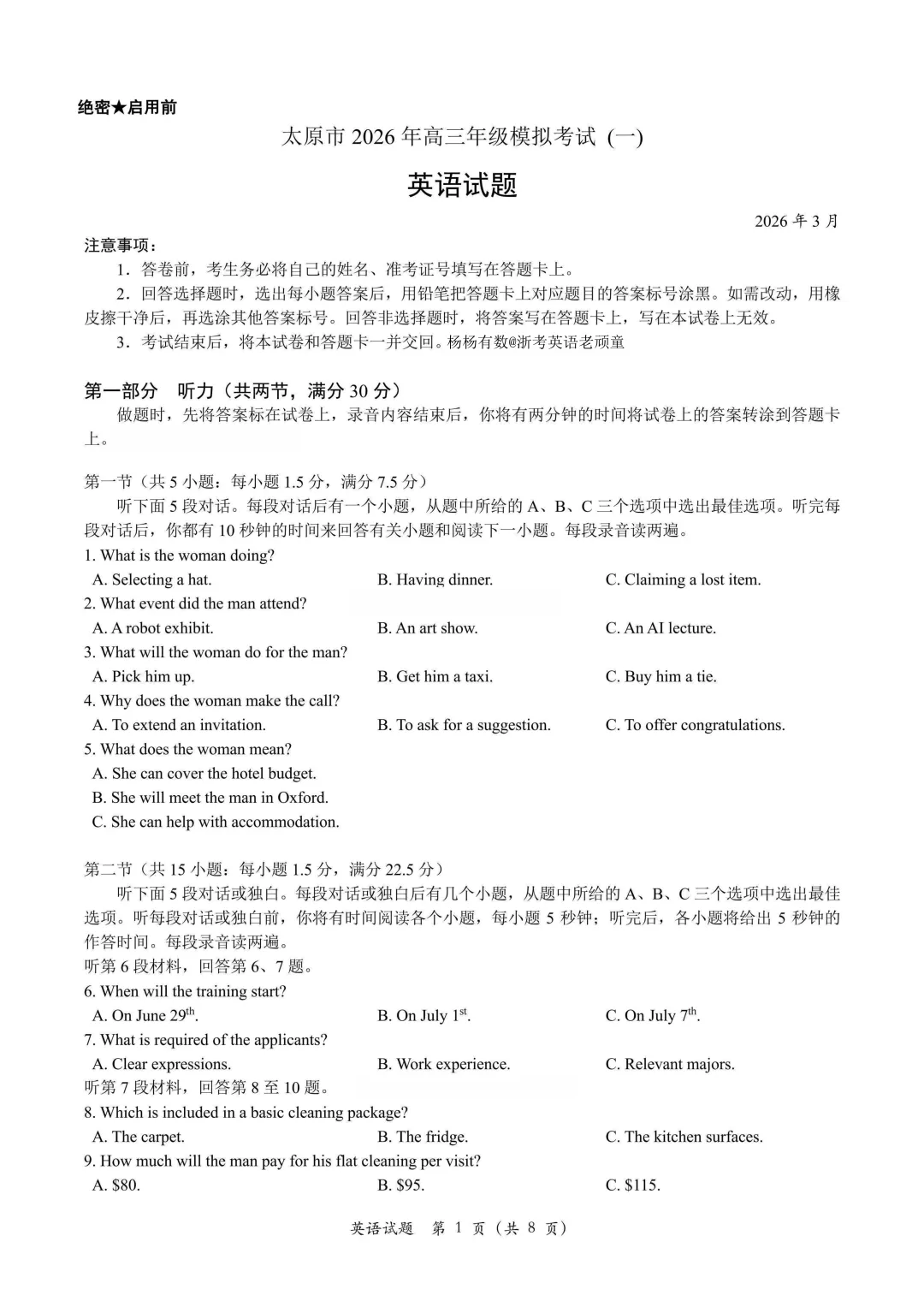 2026年3月太原一模高三英语试题(下载链接在文末)为尊重出卷老师的劳动成果与方便学习交流,试卷及答案无水印可下载。更多模拟卷,请关注本公众号“浙考英语模拟试卷”合集。为尊重出卷老师的劳动成果与方便学习交流,试卷及答案无水印可下载。更多模拟卷,请关注本公众号“浙考英语模拟试卷”合集。2026年3月太原一模高三英语试题+答案+听力-百度网盘链接