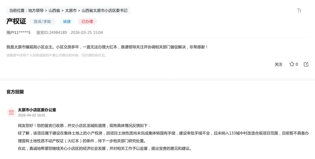 我是太原市臻观苑小区业主。小区交房多年,一直无法办理大红本,恳请领导关注并协调相关部门督促解决,非常感谢!