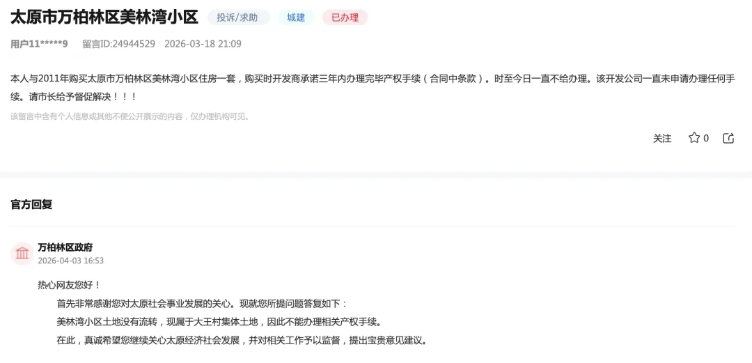 本人与2011年购买太原市万柏林区美林湾小区住房一套,购买时开发商承诺三年内办理完毕产权手续(合同中条款)。时至今日一直不给办理。该开发公司一直未申请办理任何手续。请市长给予督促解决!!!