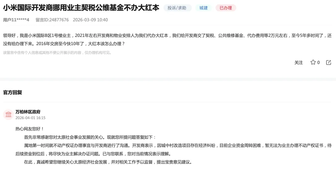我是小米国际B区1号楼业主,2021年左右开发商和物业安排人为我们代办大红本,我们给开发商交了契税、公共维修基金、代办费用等2万元左右,至今5年多时间了,还没有给办理下来。2016年交房至今快10年了,大红本该怎么办理?