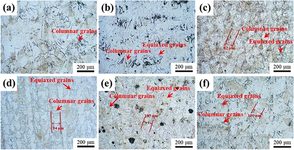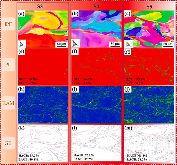 奥氏体回归: 随着能量密度的精确调控,原本几乎全铁素体的组织中,奥氏体开始在铁素体晶界处成核增长。