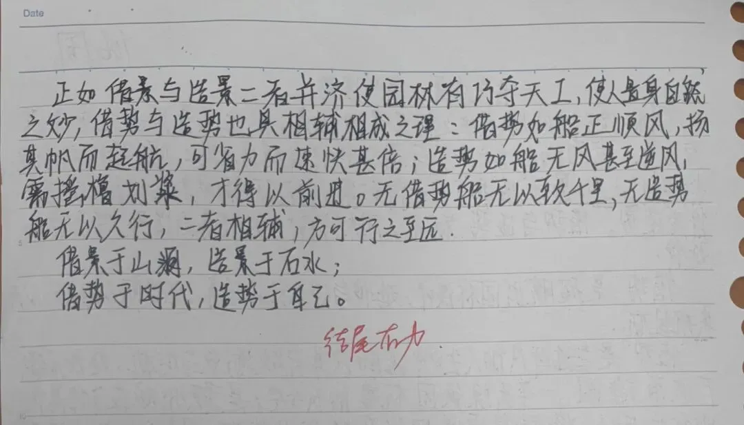 二者相谐:最高境界不是只借不造或只造不借,而是内外结合、主客统一,最终达到“虽由人作,宛自天开”的自然和谐。也就是说,高明的人工创造并不显得刻意,而是与天地环境融为一体。