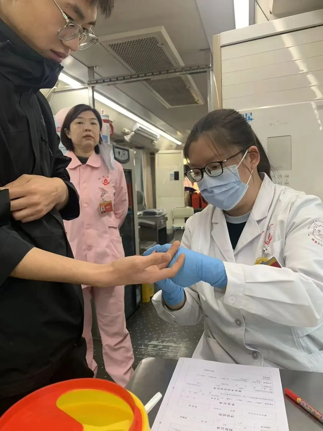 随着活动开始,师生们热情高涨,有序排起长队。大家在志愿者的耐心引导下,认真填写《无偿献血登记表》,仔细聆听医护人员讲解献血知识、注意事项及用血优惠政策 。从身份核验、健康征询,到测量血压、血型检测、血液初筛,每一个环节都严谨规范,只为确保献血安全、顺利。