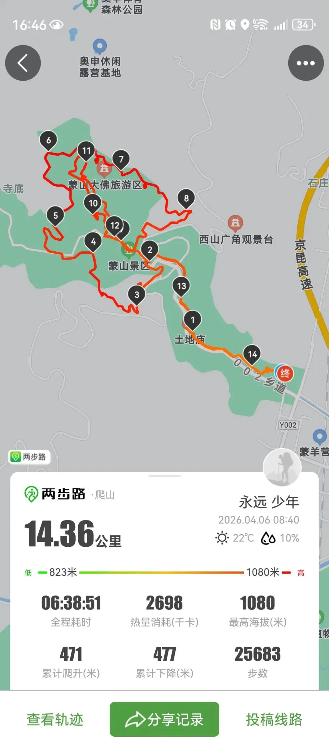 8:40 正式开爬,全程:14.36公里(入口到景区停车区 + 禅道环线 + 礼佛步道)耗时:6 小时 38 分,全程孩子自己走完,毅力超棒👍
