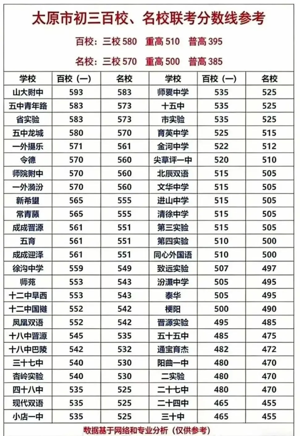 >太原市2026年初三百校、名校联考分数线参考