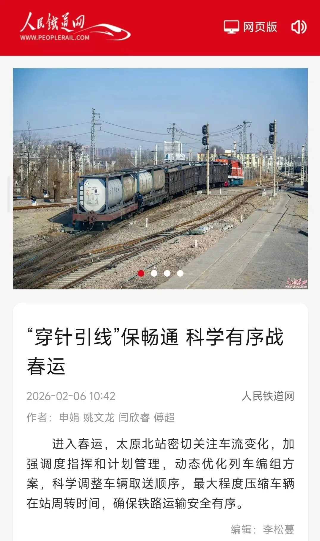 2026年2月6日,在人民铁道网发表《“穿针引线”保畅通 科学有序战春运》图片新闻一篇,内容为进入春运,太原北站密切关注车流变化,加强调度指挥和计划管理,动态优化列车编组方案,科学调整车辆取送顺序,最大程度压缩车辆在站周转时间,确保铁路运输安全有序。作者:驼峰车间 傅超、车站融媒体编辑 闫欣睿。