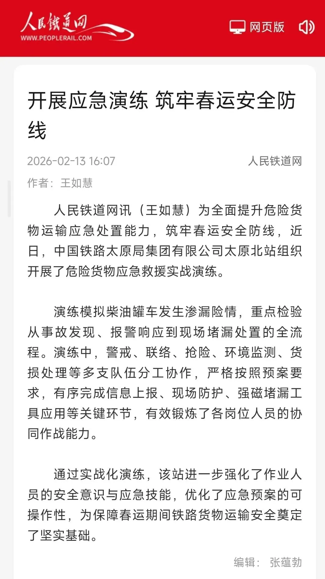 2026年2月13日,在人民铁道网发表《开展应急演练 筑牢春运安全防线》新闻一篇,内容为太原北站货检车间组织开展危险货物应急救援实战演练,为保障春运期间铁路货物运输安全奠定坚实基础。作者:货检车间 王如慧。