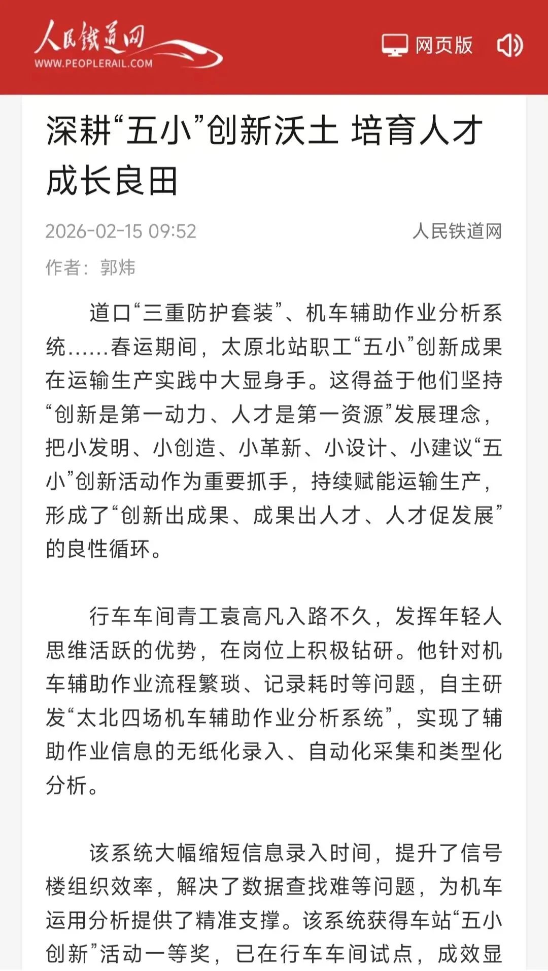 2026年2月15日,在人民铁道网发表《深耕“五小”创新沃土 培育人才成长良田》新闻一篇,内容太原北站聚焦安全生产、运输组织、节支降耗等重点领域,常态化开展“五小”创新活动,并结合“技能竞赛”“岗位练兵”“导师带徒”等载体,构建起从一线职工到技术骨干的成长通道。作者:调度车间 郭炜。