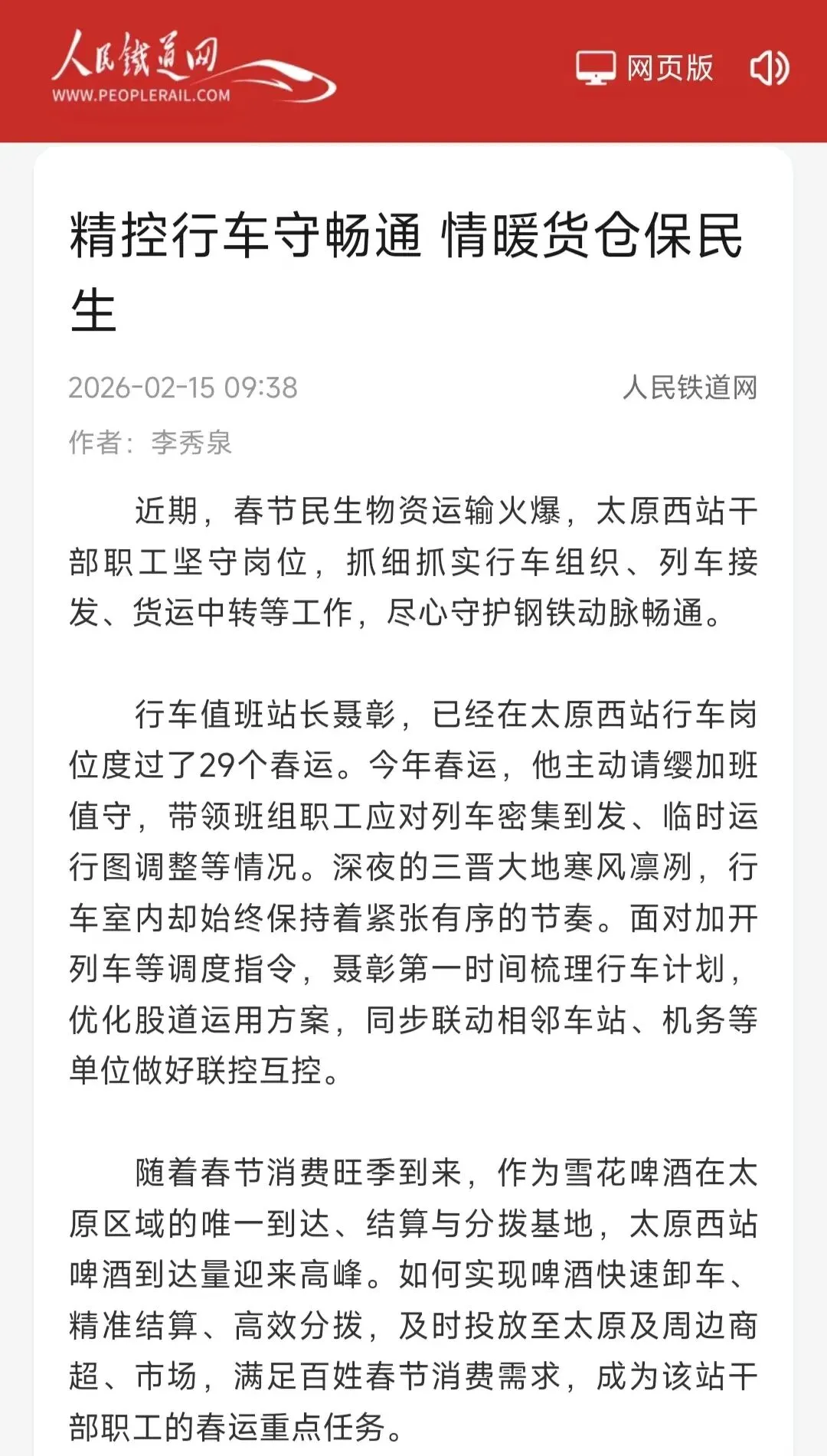 2026年2月15日,在人民铁道网发表《精控行车守畅通 情暖货仓保民生》新闻一篇,内容为春运期间,太原西站干部职工坚守岗位,抓细抓实行车组织、列车接发、货物中转等工作,尽心守护钢铁动脉畅通。作者:太原西站 李秀泉。