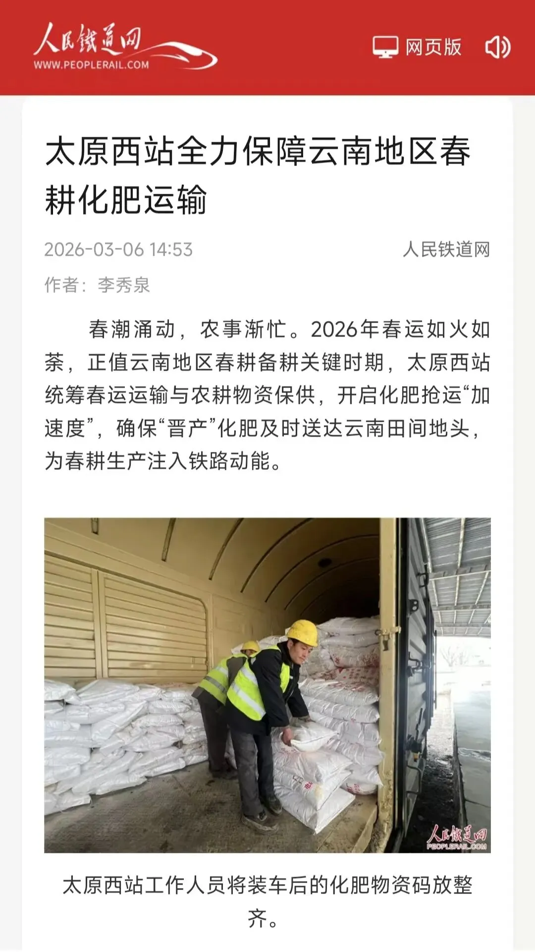 2026年3月6日,在人民铁道网发表《太原西站全力保障云南地区春耕化肥运输》图片新闻一篇,内容为太原西站统筹春运运输与农耕物资保供,开启化肥抢运“加速度”,确保“晋产”化肥及时送达云南田间地头,为春耕生产注入铁路动能。作者:太原西站 李秀泉。