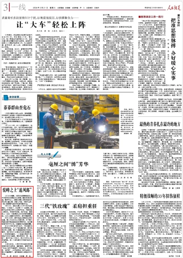 2026年3月21日,在《人民铁道报》第三版发表《驼峰之上“追风郎”》新闻一篇,内容为太原北站驼峰车间峰上丁班职工突遇作业计划变更,迅速响应赶赴峰下完成任务,保障列车溜放、编组安全高效。作者:驼峰车间 傅超、车站融媒体编辑 闫欣睿。