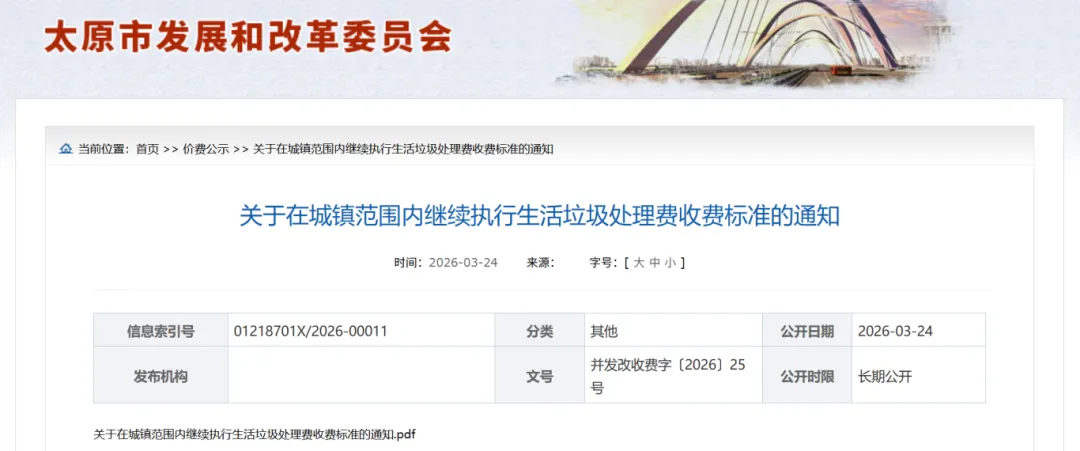 太原延续城镇生活垃圾处理费标准