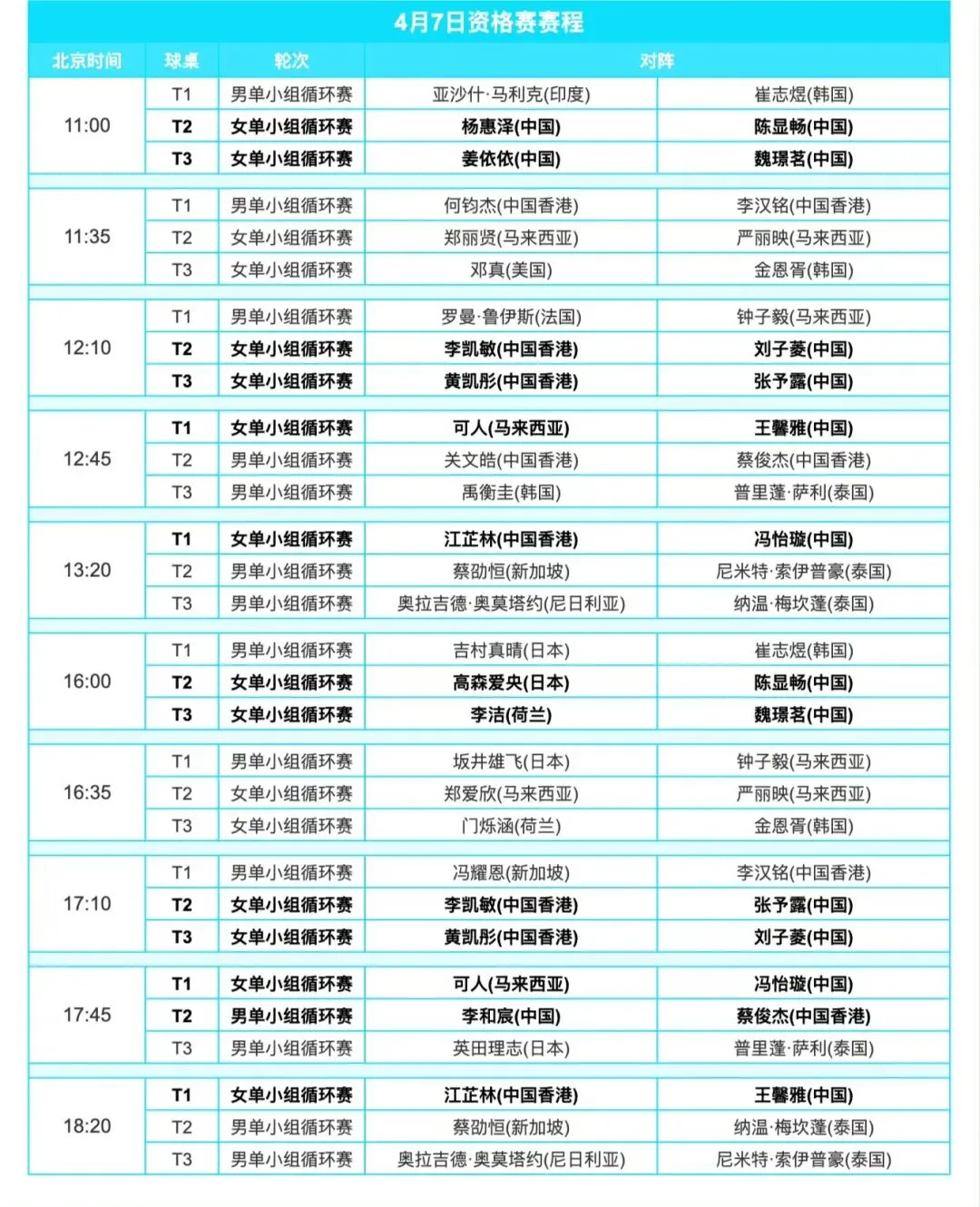 4月7日单打小组循环赛第一日全日赛程:
