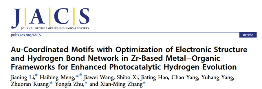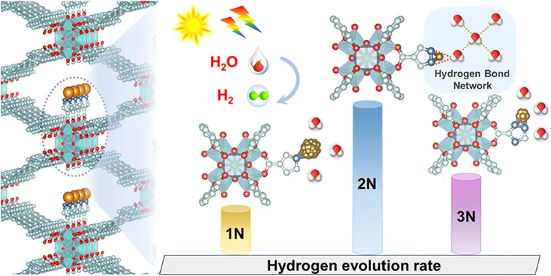引入的N-杂环配体的布朗斯台德碱性使其能够与水形成氢键。因此,通过Au配位基团,它们可以赋予Au/NU-1N、Au/NU-2N和Au/NU-3N不同的氢键网络,从而调控质子转移动力学,进而影响光催化析氢反应。为探究氢键网络结构,该团队采用ATR-FTIR分析(图3a)。O–H伸缩振动区(3000–4000 cm⁻¹)可分解为三类组分:约 3200 cm⁻¹ 的四配位氢键水(冰状水结构的特征峰)、约 3400 cm⁻¹ 的双配位氢键水(代表液态水)以及3600 cm⁻¹的自由水。定量拟合结果表明,Au/NU-2N 的自由水比例最低(7.49%),低于 Au/NU-1N(7.59%)和 Au/NU-3N(7.84%),说明其具有更强的氢键网络,使更多水分子参与氢键作用,有利于构建连续质子传输通道并降低传输能垒。1H NMR 表征(图3b)进一步验证了这一结论。与1N和 3N 相比,Au/NU-2N 中水质子信号发生明显下移,表明氢键增强导致质子去屏蔽效应增强。交流阻抗测试结果(图3c)表明,随着相对湿度由45%提升至95%,样品的阻抗显著降低,质子电导率提高。在95%湿度和25 °C条件下,Au/NU-2N的质子电导率达到2.26 × 10-4 S·cm⁻¹,明显高于Au/NU-1N(6.72 × 10-5 S·cm⁻¹)和Au/NU-3N(6.10 × 10-5 S·cm⁻¹),表明其氢键网络更有利于质子传输。温度升高同样促进质子迁移(图3d)。通过阿伦尼乌斯分析进一步确定了Au/NU-1N、Au/NU-2N和Au/NU-3N的质子传导活化能分别为0.28 eV、0.17 eV和0.22 eV(图3e)。所有值均低于0.4 eV的阈值,与格罗特胡斯机制相符。Au/NU-2N的活化能最低,这有利于质子通过氢键网络转移,并能为后续的光催化析氢反应提供充足的质子。这些结果证实,由N-杂环配体诱导的Au配位基序能够在Au/NU-1N、Au/NU-2N和Au/NU-3N中建立氢键网络,从而促进质子转移。值得注意的是,Au/NU-2N展现出最佳的氢键网络,为光催化析氢反应提供了充足的质子供应,使其位于催化位点附近。除质子供给外,催化剂对质子还原能力同样关键。计算得到H* 吸附自由能(ΔGH*)(图3f)分别为1.15、0.88 和2.13 eV,其中Au/NU-2N最接近理想值,表明其在热力学上更有利于析氢反应。综上,含氮配体诱导的Au配位结构能够构建氢键网络并调控质子传输,其中2N在氢键强度、质子导电性和还原动力学之间实现最佳平衡,从而为光催化析氢提供充足质子并显著提升反应效率。
