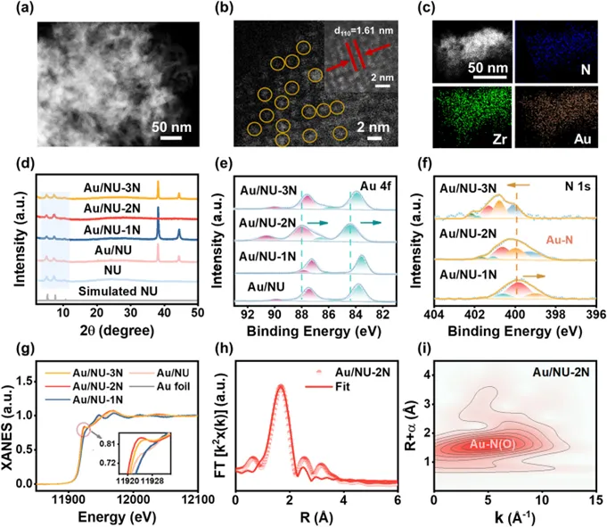 Fig. 2.(a, b) HAADF-STEM images (orange circles represent Au single atoms) and (c) elemental mappings of Au/NU-2N. (d) PXRD patterns of simulated NU, NU, Au/NU, Au/NU-1N, Au/NU-2N, and Au/NU-3N. (e) Au 4f XPS spectra of Au/NU, Au/NU-1N, Au/NU-2N, and Au/NU-3N. (f) N 1s XPS spectra of Au/NU-1N, Au/NU-2N, and Au/NU-3N. (g) Au L3-edge XANES spectra of Au foil, Au/NU, Au/NU-1N, Au/NU-2N, and Au/NU-3N. (h) Au L3-edge EXAFS spectra of Au/NU-2N and its corresponding fitting curve. (i) The Au L3-edge WT-EXAFS plots of Au/NU-2N.