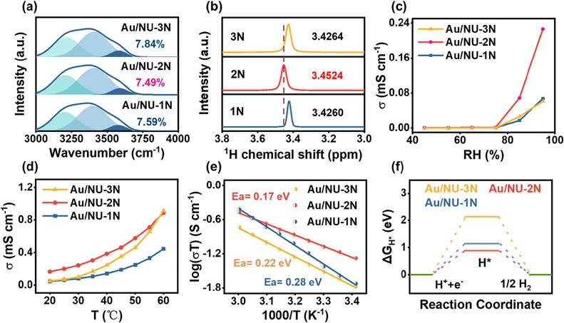 Fig. 3. (a) ATR-FTIR of Au/NU-1N, Au/NU-2N, and Au/NU-3N in water. (b) 1H NMR chemical shifts for 1N, 2N, and 3N in deionized water/DMSO-d6. (c) Humidity-dependent proton conductivity of Au/NU-1N, Au/NU-2N, and Au/NU-3N at 25 °C. (d) Temperature-dependent proton conductivities for Au/NU-1N, Au/NU-2N, and Au/NU-3N at 95% relative humidity. (e) Arrhenius plots of the proton conductivity of Au/NU-1N, Au/NU-2N, and Au/NU-3N. (f) Gibbs free energy diagrams of Au/NU-1N, Au/NU-2N, and Au/NU-3N toward photocatalytic hydrogen evolution.