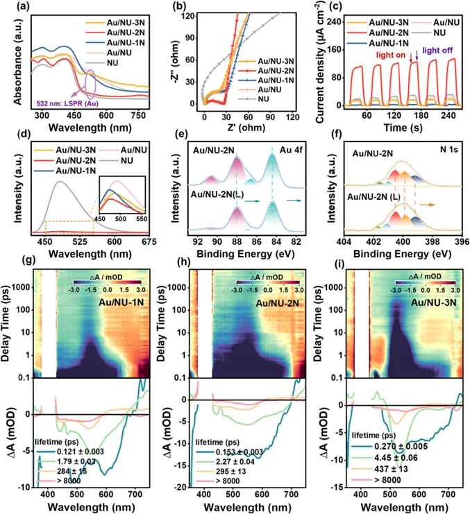 Fig. 4. (a) UV–vis DRS, (b) EIS spectra, (c) transient photocurrent responses, and (d) steady-state PL spectra of NU, Au/NU, Au/NU-1N, Au/NU-2N, and Au/NU-3N. XPS spectra of (e) Au 4f and (f) N 1s of Au/NU-2N before and after light illumination. Time evolution of femtosecond TA spectra of (g) Au/NU-1N, (h) Au/NU-2N, and (i) Au/NU-3N in H2O upon 400 nm excitation, monitored over the 440–700 nm spectral window within an 8 ns display range. Evolution-Associated Difference Spectra (EADS) obtained from the global analysis based on a sequential model are shown in the lower panels below the corresponding TA spectra. The fitting time constants are shown in the legends.