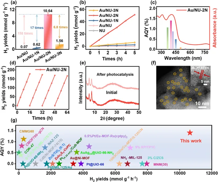 Fig. 5. (a) Photocatalytic hydrogen evolution rates of Au/NU, Au/NU-1N, Au/NU-2N, and Au/NU-3N, measured using ascorbic acid as a sacrificial agent. (b) Photocatalytic hydrogen evolution performance of NU, Au/NU, Au/NU-1N, Au/NU-2N, and Au/NU-3N upon 5 h irradiation. (c) The wavelength-dependent AQY of photocatalytic hydrogen evolution of Au/NU-2N. (d) Photocatalytic hydrogen evolution stability of Au/NU-2N upon 64 h irradiation. (e) PXRD patterns of Au/NU-2N before and after photocatalytic hydrogen evolution. (f) HAADF-STEM image of Au/NU-2N after 4 cycles of photocatalytic hydrogen evolution (orange circles represent Au single atoms). (g) Comparison of photocatalytic hydrogen evolution performance and AQY for Au/NU-2N and other MOF-based photocatalysts.