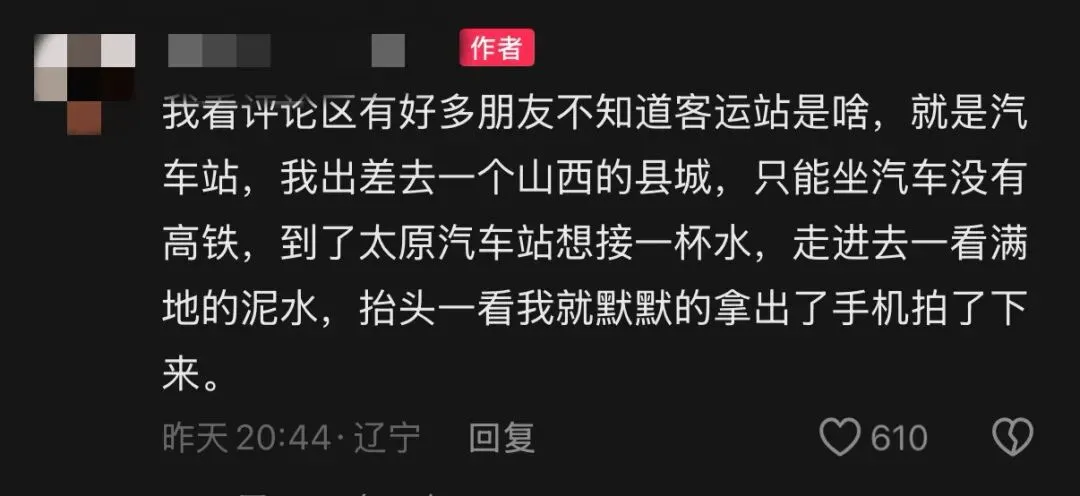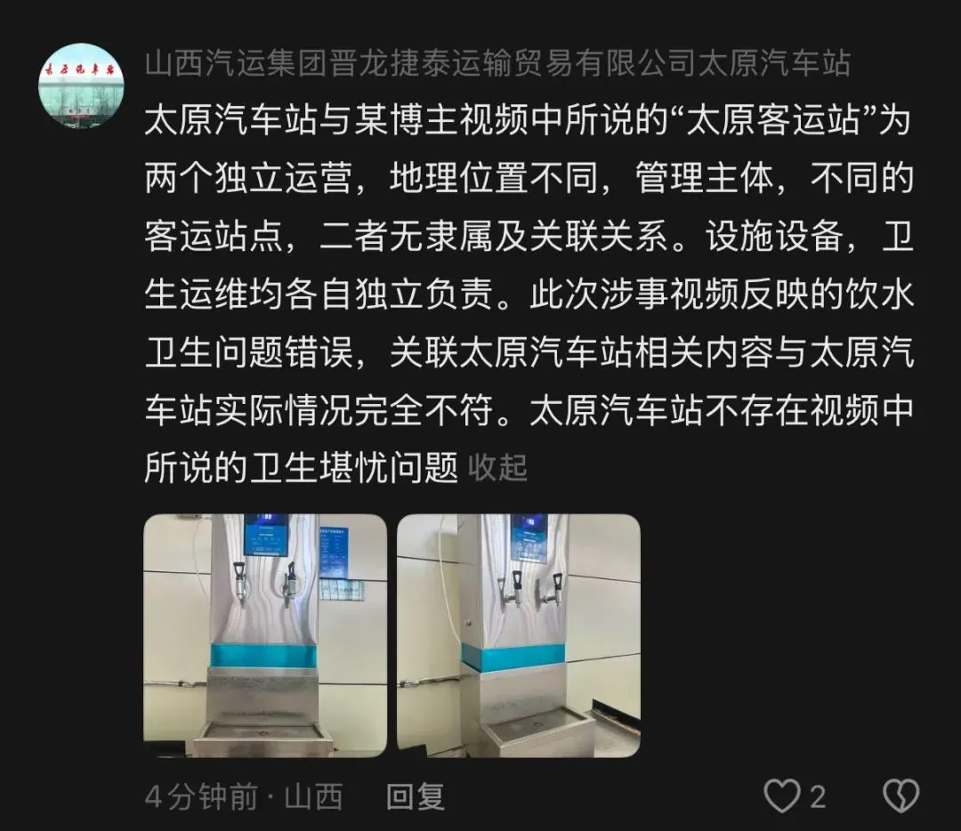 随后,记者在该视频下方看到一个自称“太原汽车站”的账号评论道:“太原汽车站与某博主视频中所说的‘太原客运站’为两个独立运营、地理位置不同、管理主体不同的客运站点,二者无隶属及关联关系。设施设备、卫生运维均各自独立负责。此次涉事视频反映的饮水卫生问题错误关联太原汽车站,相关内容与太原汽车站实际情况完全不符。太原汽车站不存在视频中所说的卫生堪忧问题。”并附上了两张饮水机的图片。