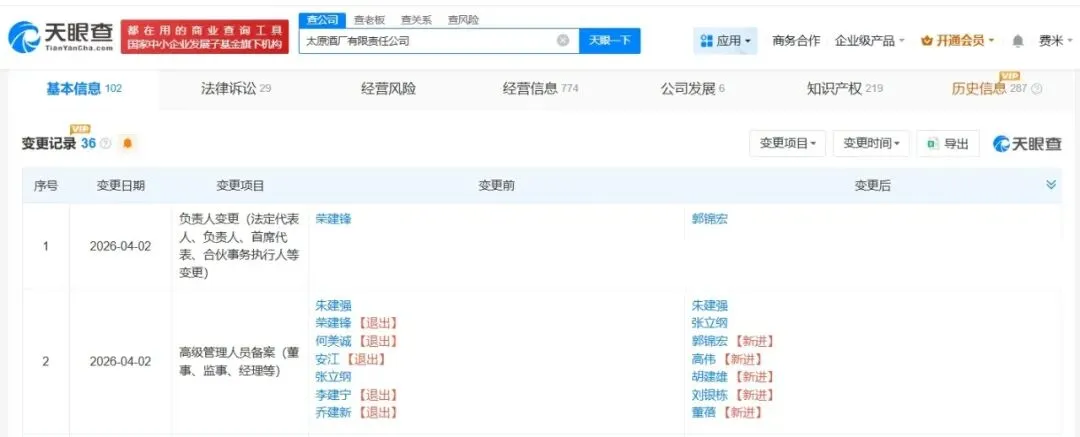 近日,太原酒厂有限责任公司发生工商变更,荣建锋卸任法定代表人、董事长,由郭锦宏接任。同时,多位高管发生变更。