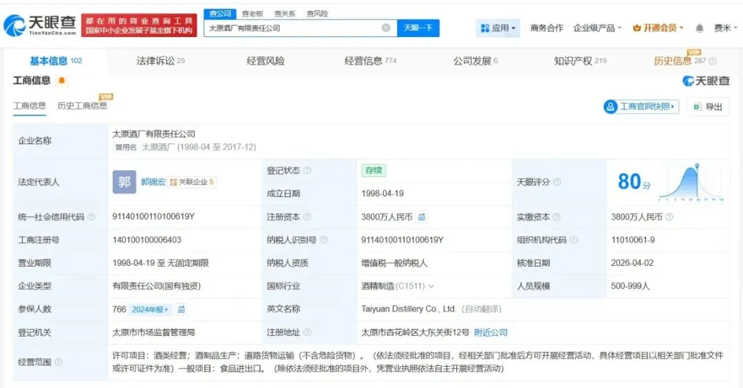 该公司成立于1998年4月,注册资本3800万人民币,经营范围包括酒类经营、酒制品生产、道路货物运输等,由太原市人民政府国有资产监督管理委员会全资持股。
