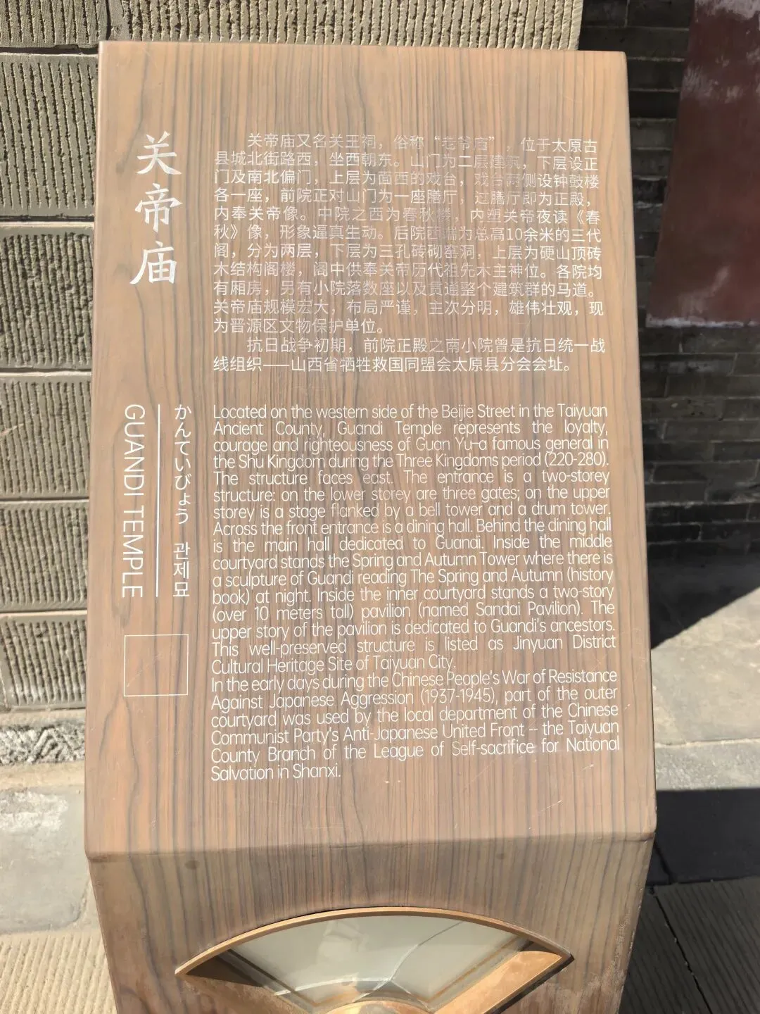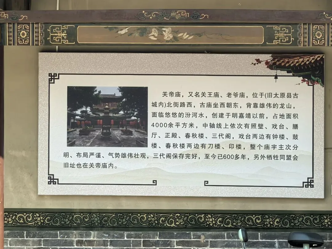 关帝庙,又名关王庙、老爷庙,位于(旧太原县古城内)北街路西,古庙坐西朝东,背靠雄伟的龙山,面临悠悠的汾河水,创建于明嘉靖以前,占地面积4000余平方米,中轴线上依次有照壁、戏台、膳厅、正殿、春秋楼、三代阁,戏台两边有钟楼、鼓楼、春秋楼两边有刀楼、印楼,整个庙宇主次分