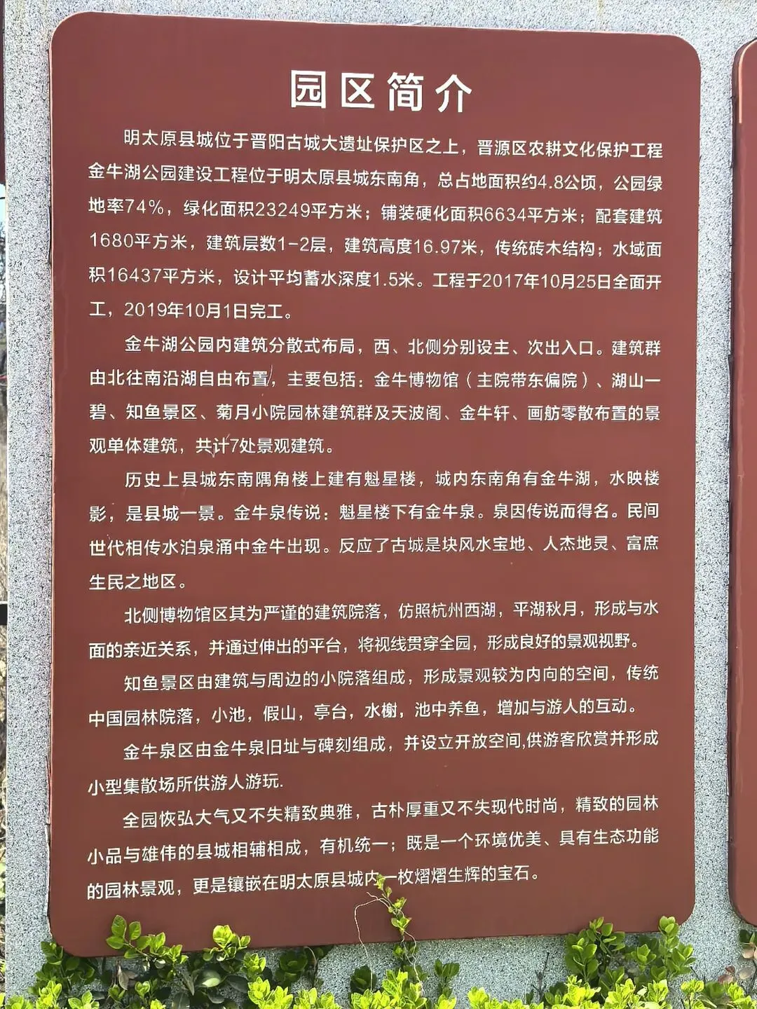 明太原县城位于晋阳古城大遗址保护区之上,晋源区农耕文化保护工程金牛湖公园建设工程位于明太原县城东南角,总占地面积约4.8公顷,公园绿地率74%,绿化面积23249平方米;铺装硬化面积6634平方米;配套建筑1680平方米,建筑层数1-2层,建筑高度16.97米,传统砖木结构;水域面积16437平方米,设计平均蓄水深度1.5米。工程于2017年10月25日全面开工,2019年10月1日完工。