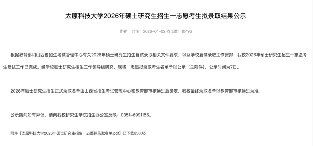 >太原科技大学公示2026年硕士研究生招生一志愿考生拟录取结果