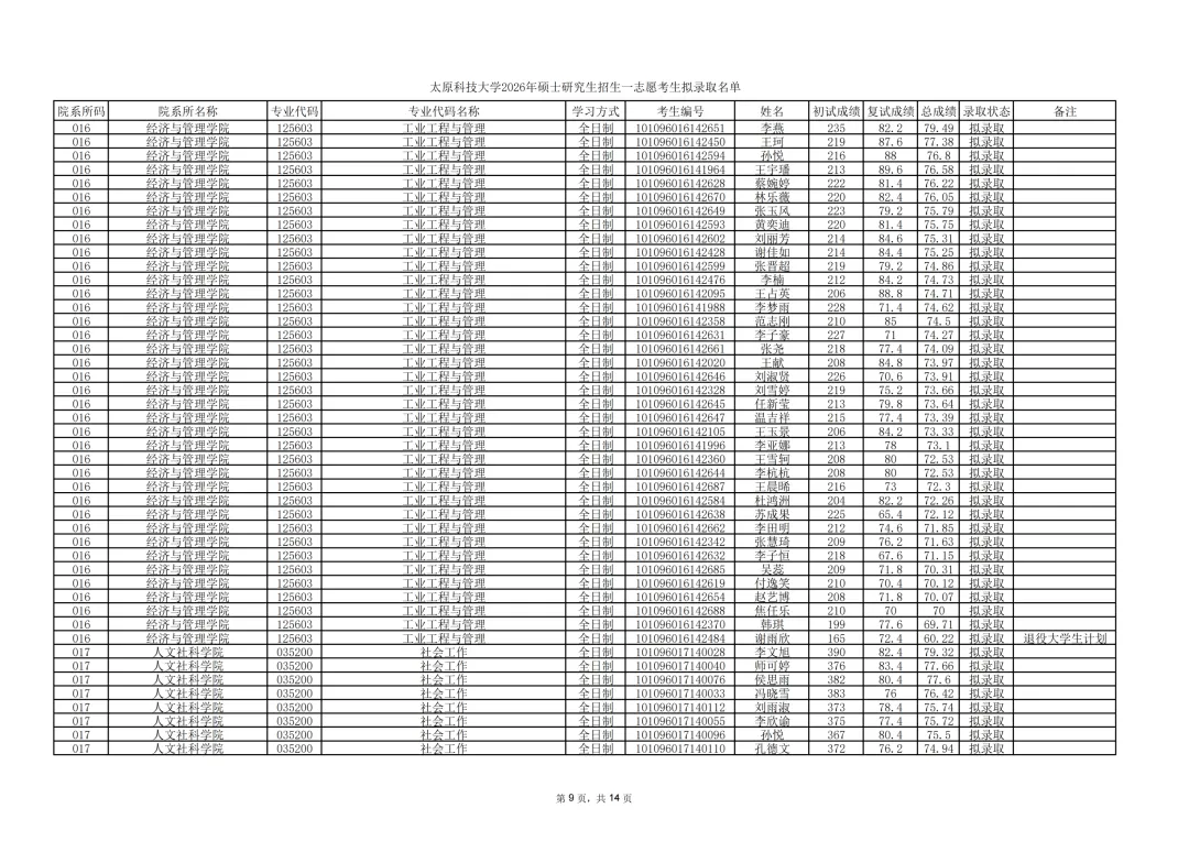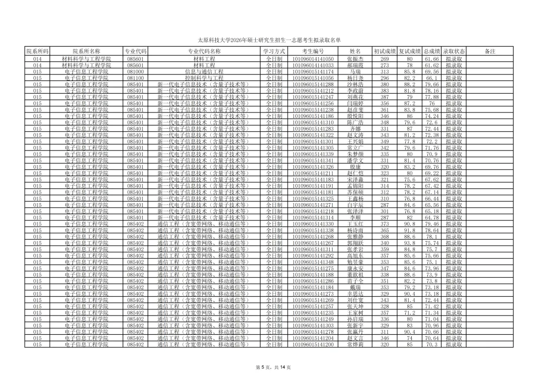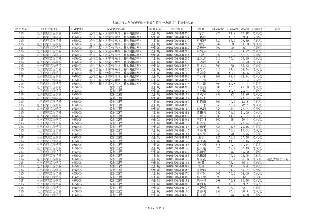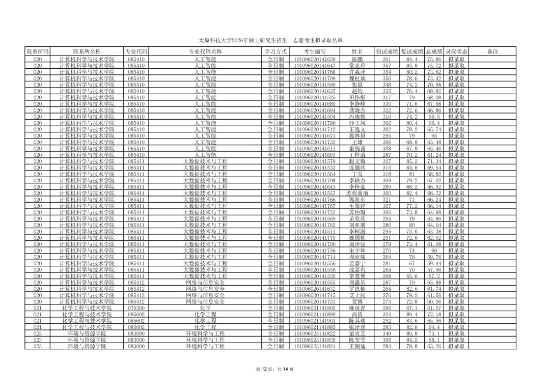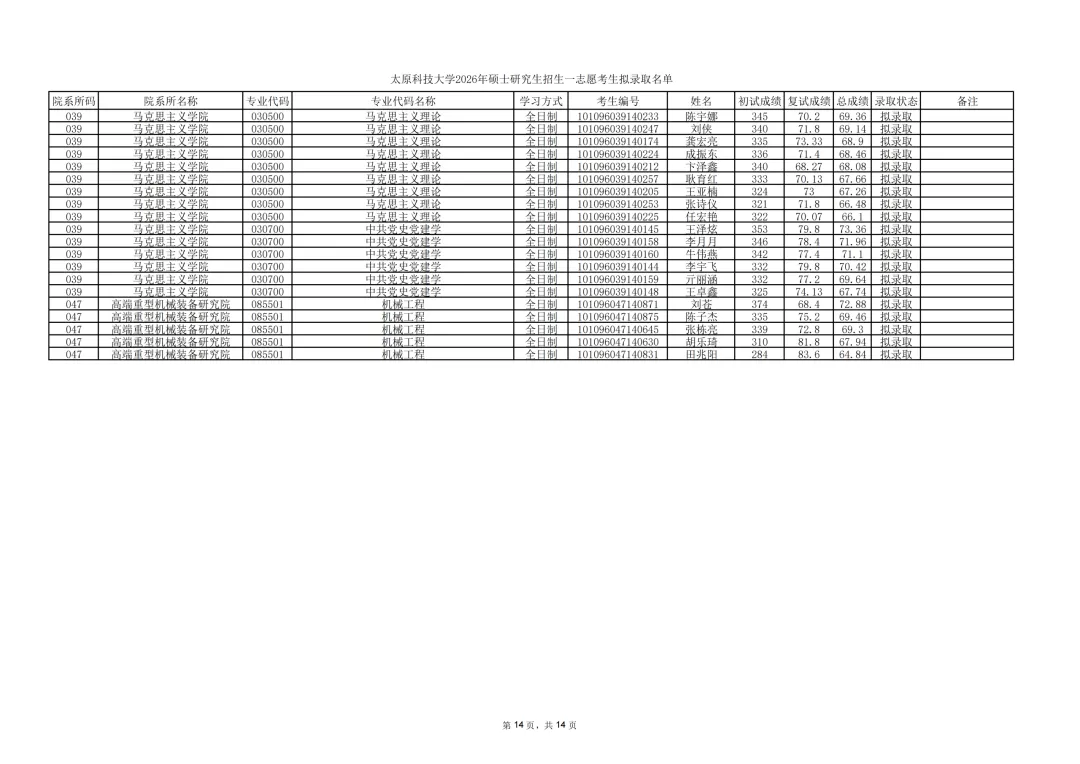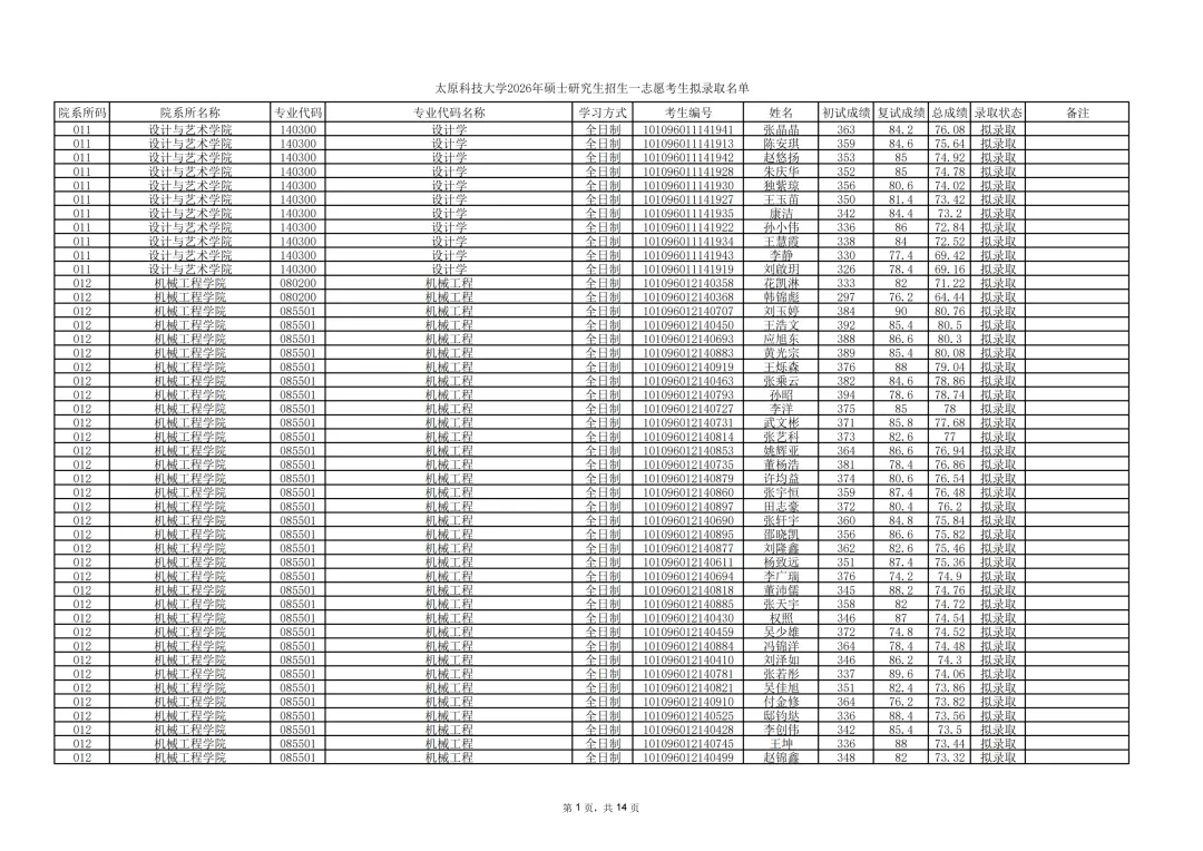 2026年硕士研究生招生一志愿考生拟录取名单: