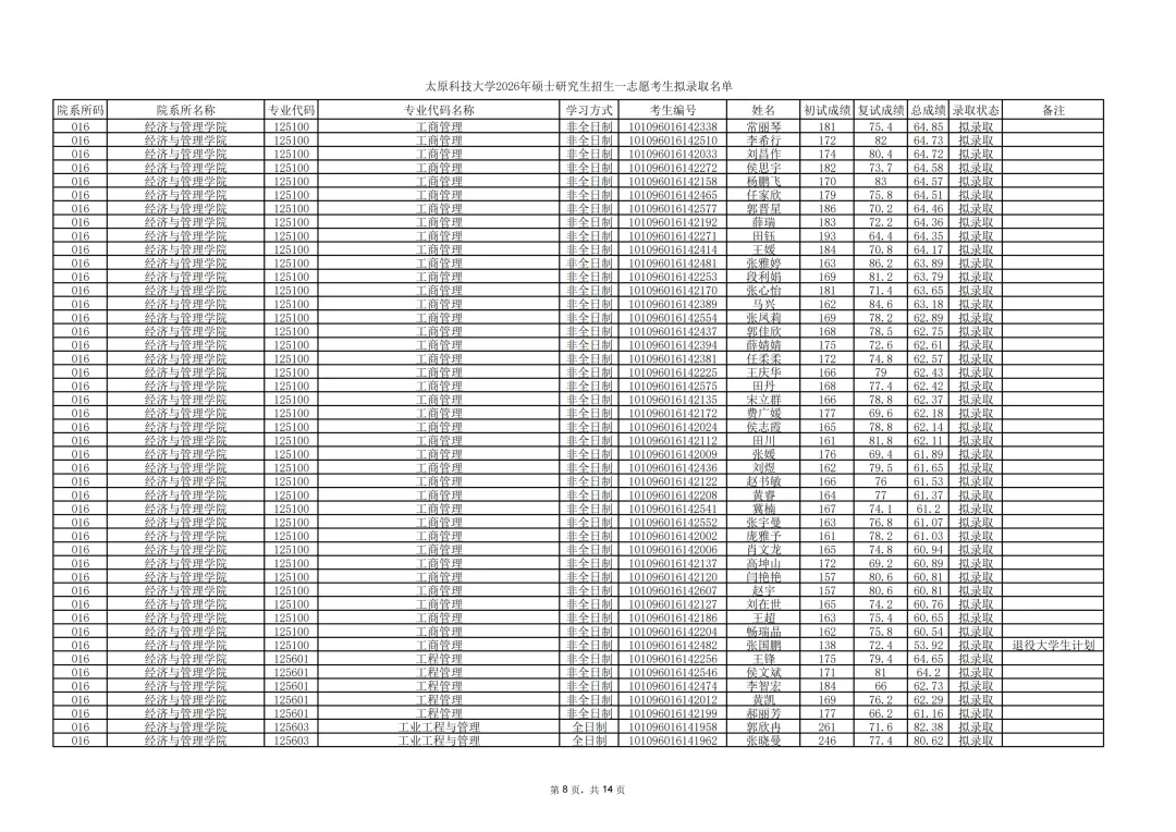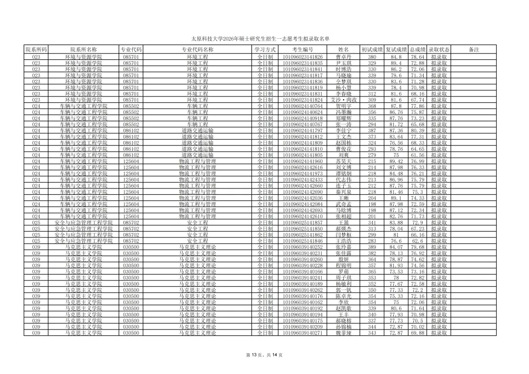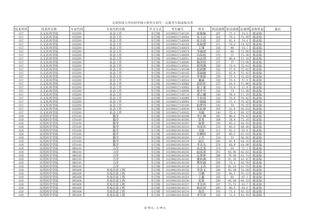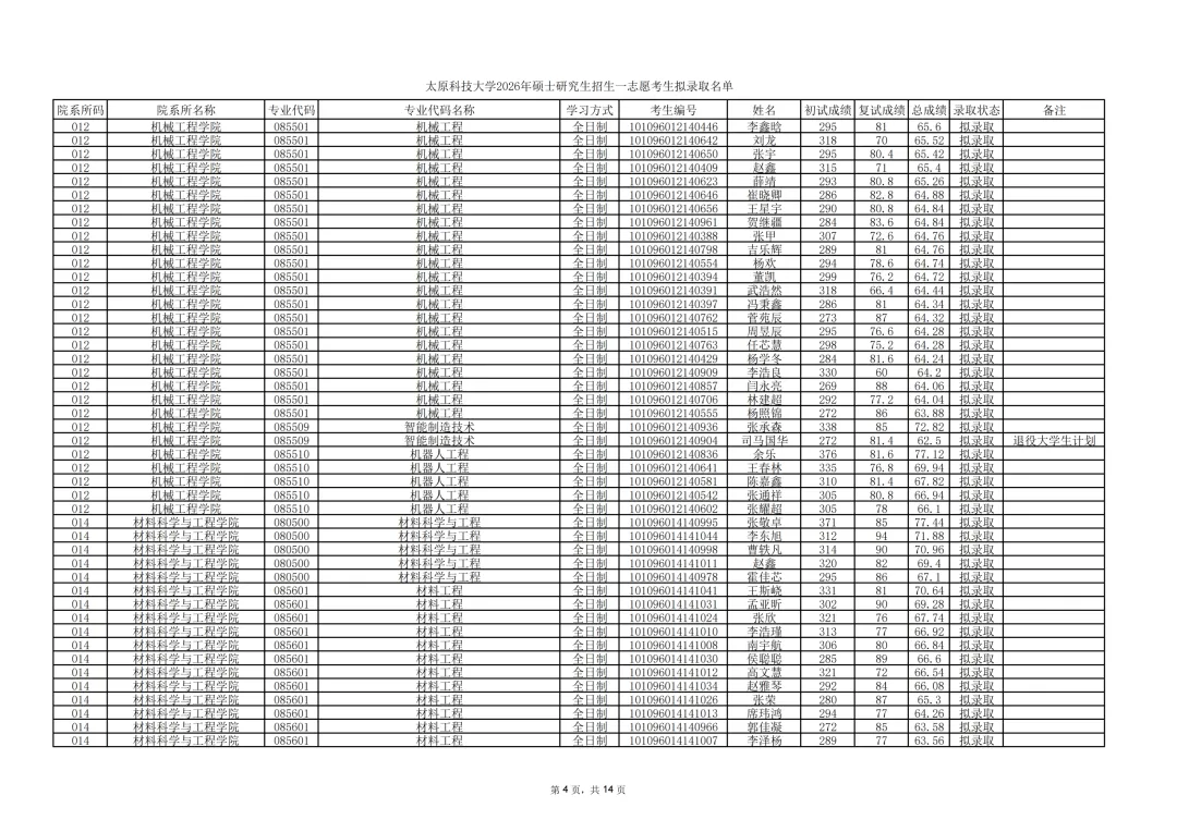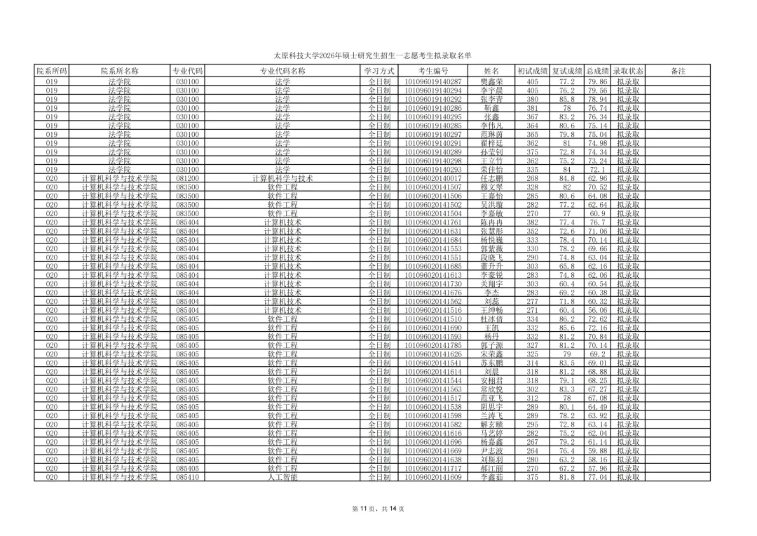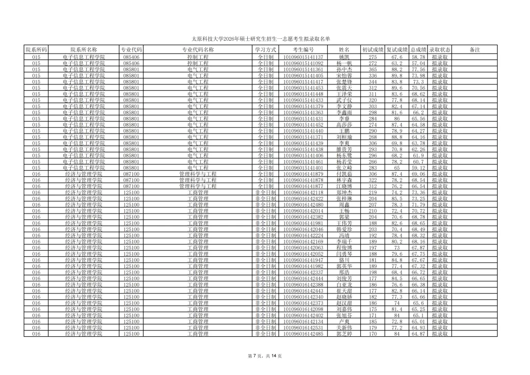 太原科技大学公示2026年硕士研究生招生一志愿考生拟录取结果