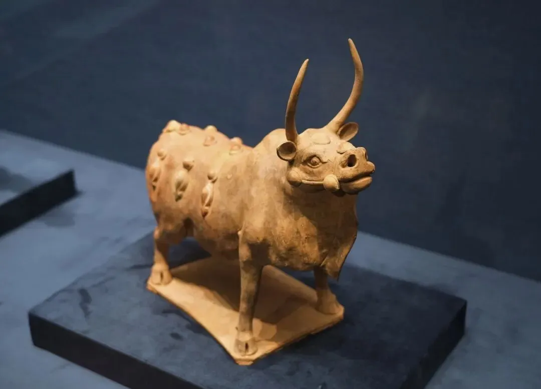 陶牛,体格雄健,牛头高昂,脖颈坚挺,犄角冲天, 佩戴有络头、璎珞和杏叶等。四肢有力的叉开、支撑着强壮的躯体。神态威猛,生动写实,匠师对牛的刻画,除了卓越的造型能力,还显然得益于对动物的细致观察。