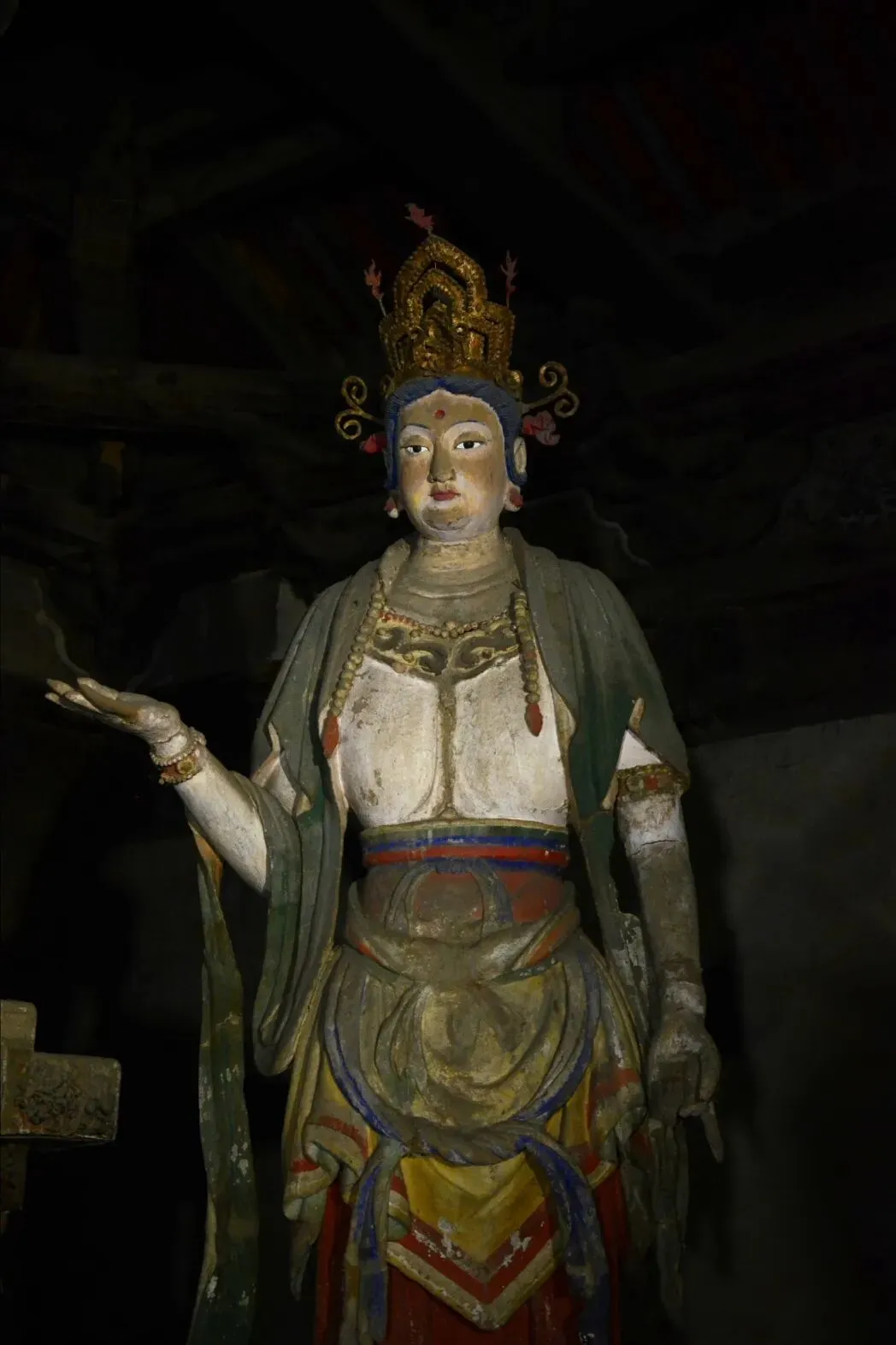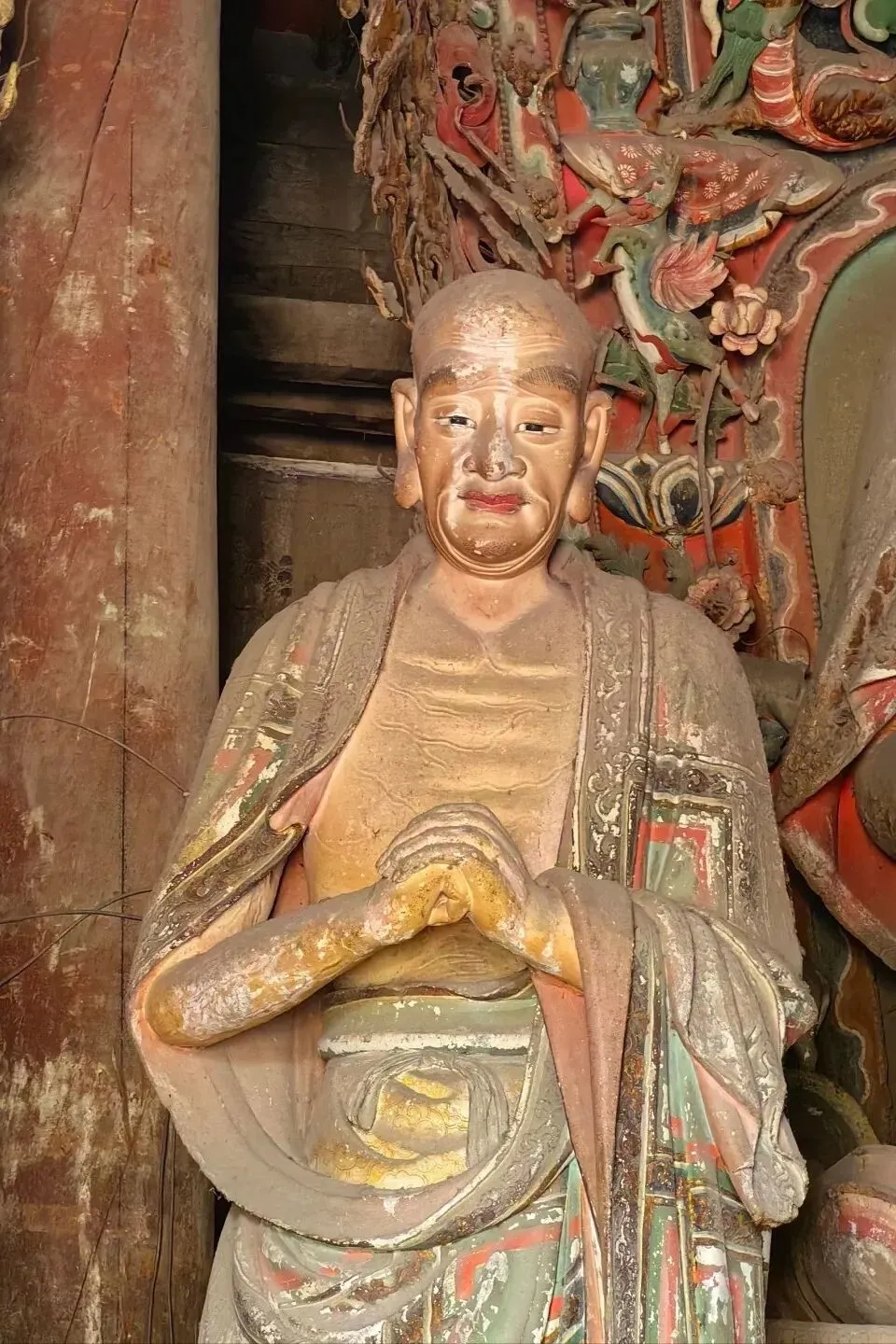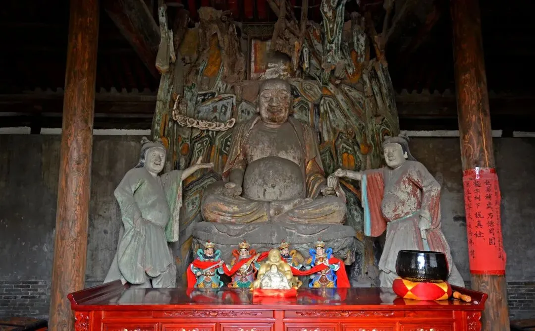 与娄睿墓相隔不远的明秀寺,为这段厚重历史增添了一抹宁静的禅意。这座始建于东汉的古寺,虽经战火重建,仍保留着明代的建筑与彩塑精华。绿琉璃瓦覆盖的大殿内,三世佛彩塑背衬金龙佛光,壁上《佛说法图》《千佛图》色彩依旧鲜艳,将千年的信仰传承与建筑艺术完美融合,成为明清太原佛教文化的缩影。