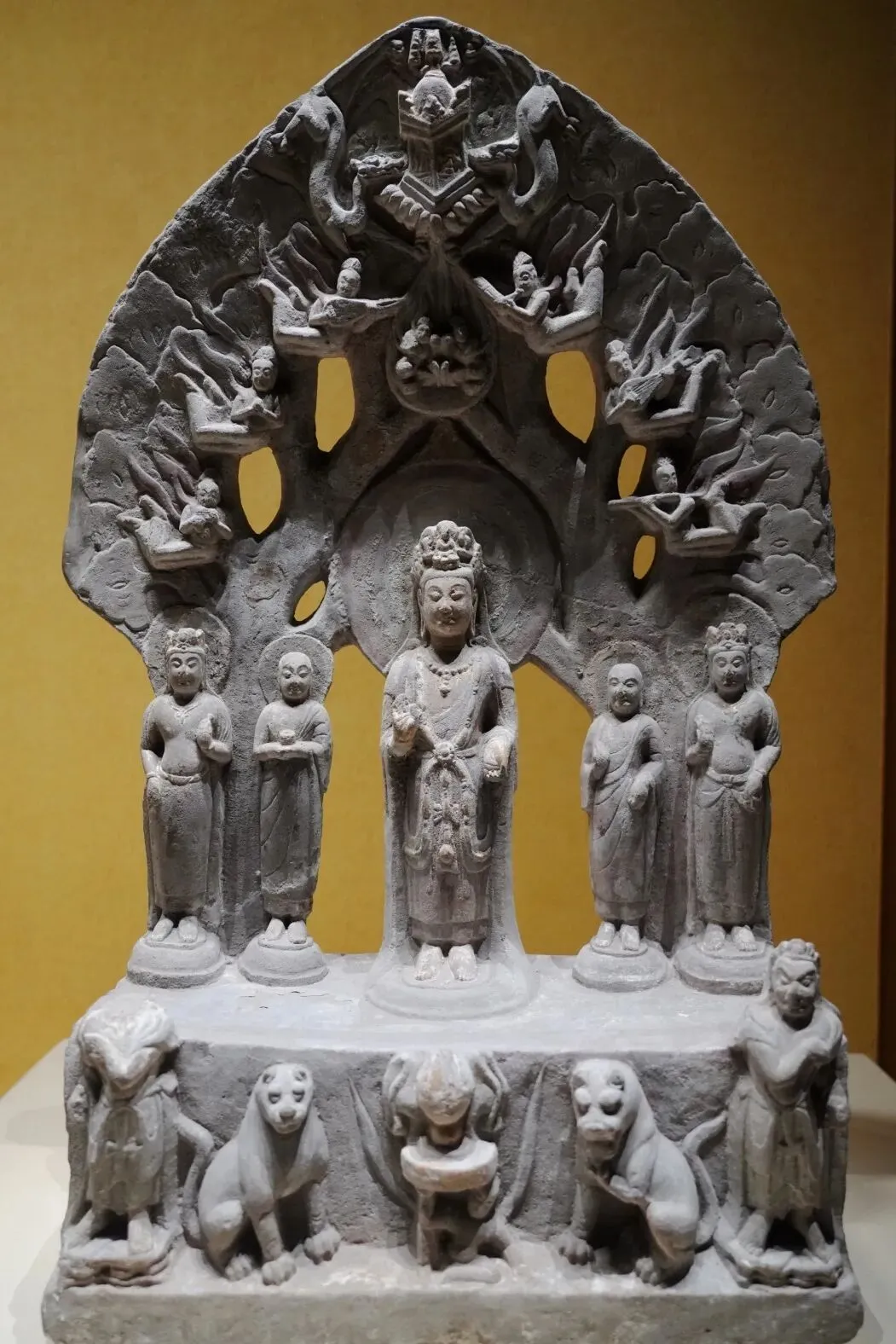 北魏四面造像塔由多块方形石构件叠砌而成,每面开龛造像,龛外雕饰图案或故事画,构图严谨,是佛教与中国楼阁式塔结合的独特产物,为研究早期佛塔建筑演变提供了珍贵实例。