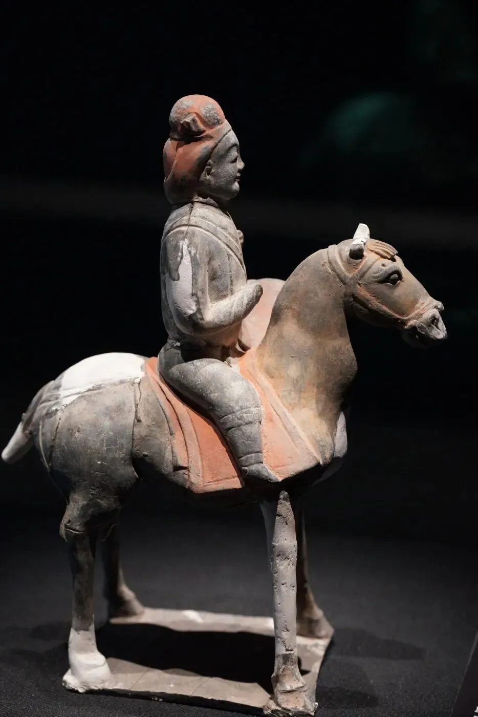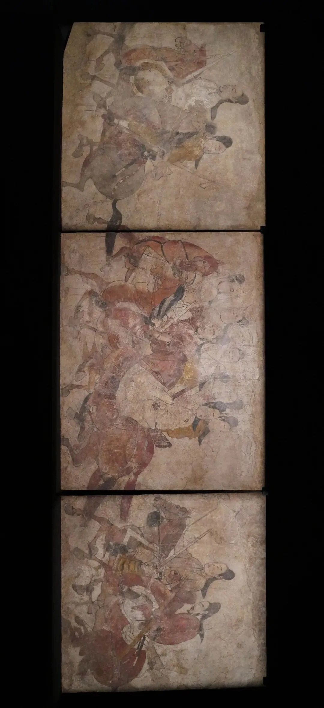 山西博物馆藏北齐娄睿墓鞍马出行图壁画,采用长卷式构图分多段描绘墓主出行场景,每段前设二骑作前导,后续八骑紧随,人物表情动作细腻生动,马匹动态各异,展现鲜卑民族特色与北齐绘画技艺。壁画以铁线勾勒与色彩晕染技法呈现,色彩以赭红、黄、黑为主调,体现单线勾勒与重彩填染的传统技法,兼具汉魏遗韵与唐代画风先声。