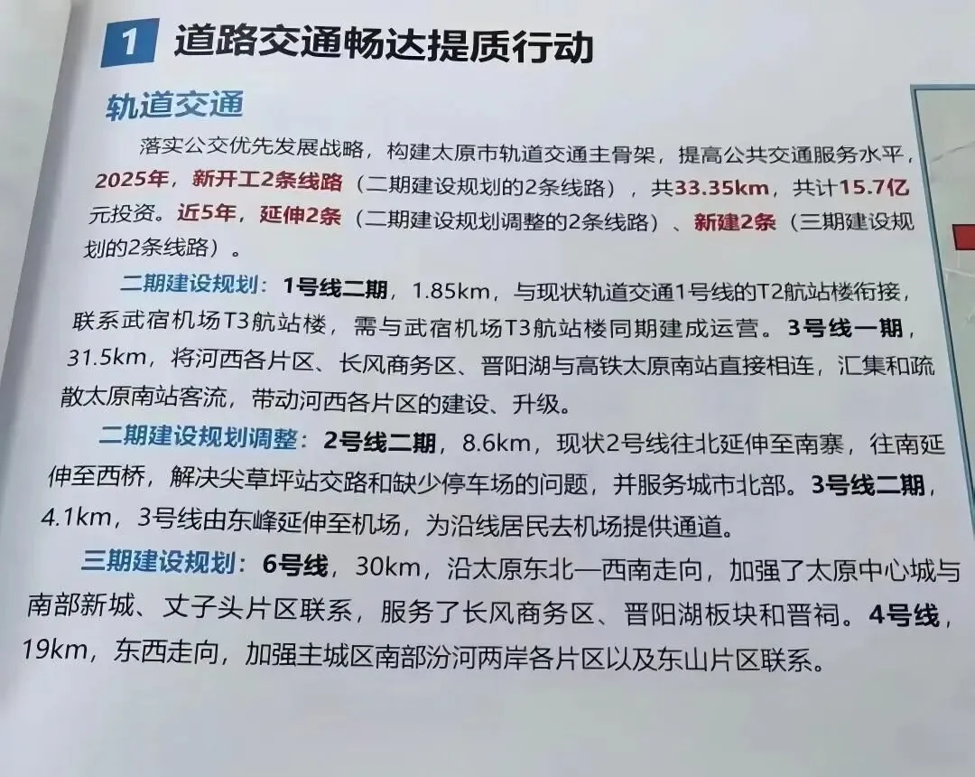 目前,太原市已开通运营地铁2号线一期工程和地铁1号线工程,3号线已列入规划但推进面临不确定性。国家层面对于城市轨道交通建设实行“严格规范”的政策,审批门槛提高,更加强调客流支撑能力、财政可承受能力和规划科学性。