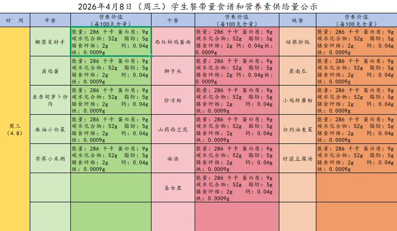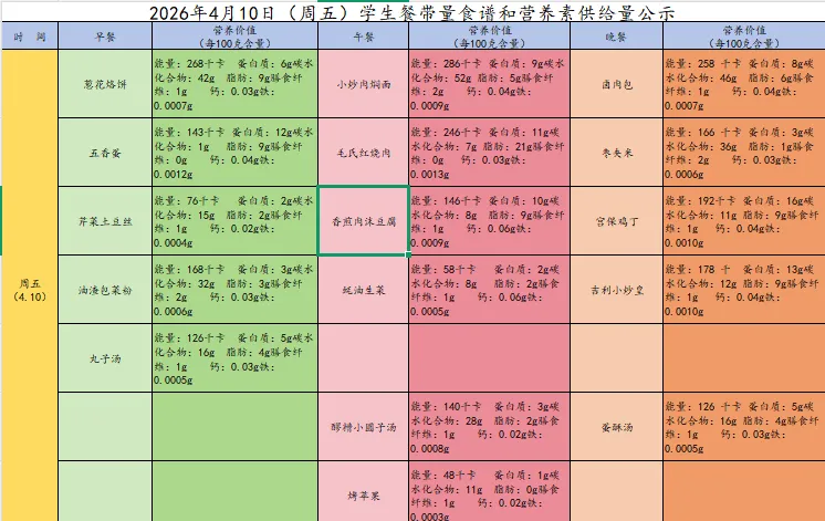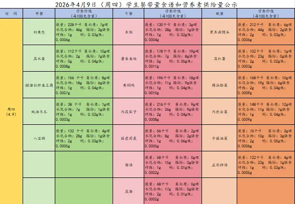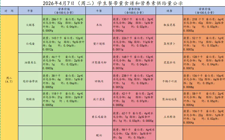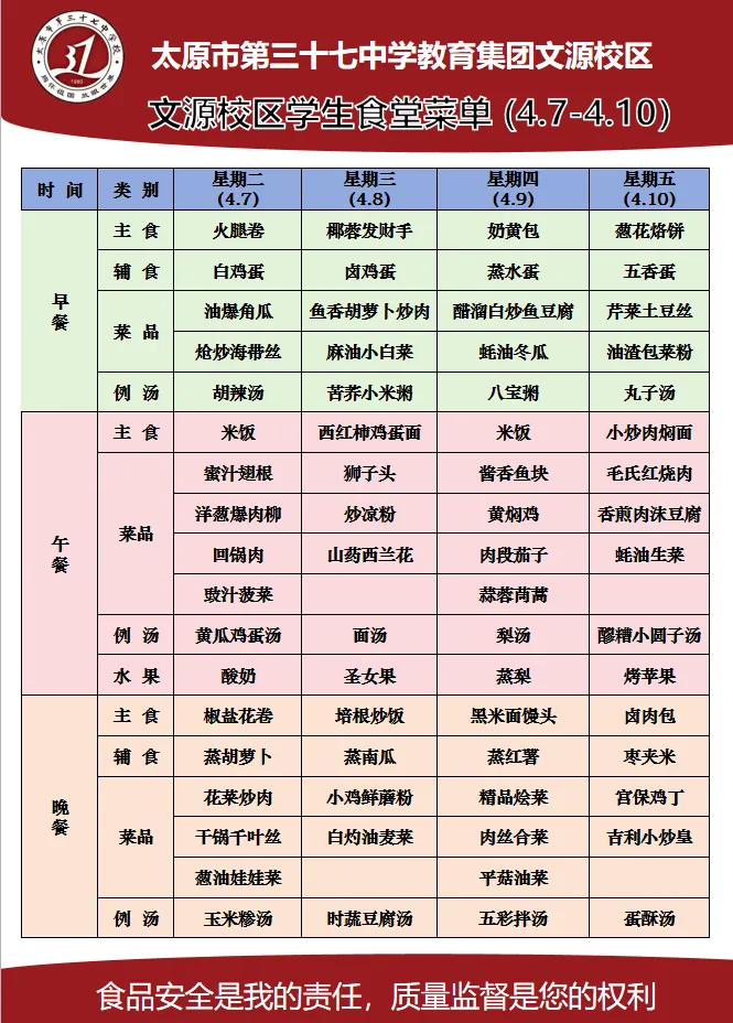 感谢您对太原市第三十七中学校的支持与关注。为了让您全面了解三十七中学子在学校的饮食情况,根据《太原市中小学校园食品安全和膳食经费管理监督办法》相关规定,学校每周餐带量食谱和营养素供给量确保学生膳食安全、营养、均衡,满足孩子健康成长需要,为我校学生做出安全健康可口的饭菜。给孩子一个健康、美味的成长时光,是您的期待,也是我们的责任!现将本周(4月7日—4月10日)的学生菜谱进行公示,欢迎各位师生及家长监督!