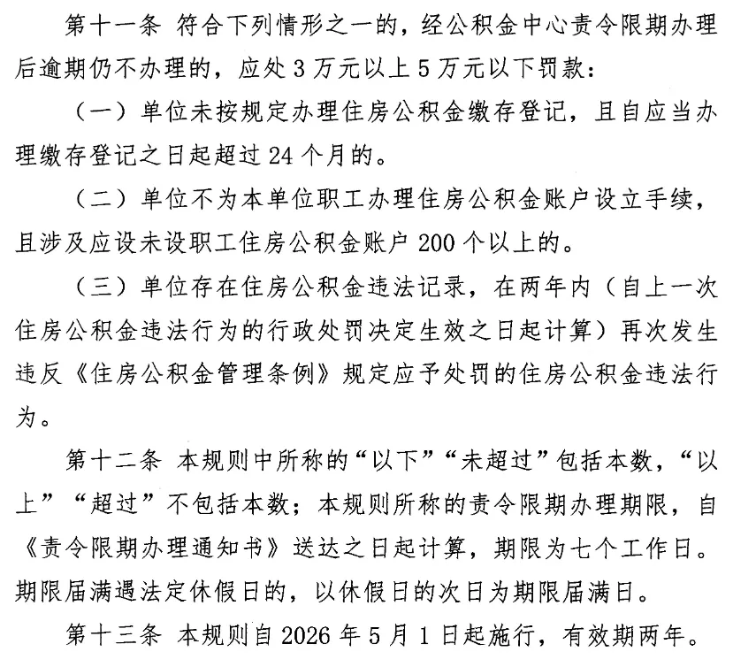 3️⃣ 还有就是情节严重的,处以3万元以上5万元以下罚款。包括以下几种情形:单位未按规定办理缴存登记,逾期超过24个月的;不为职工办理账户设立手续,涉及职工人数在200人以上的;以及单位此前已有住房公积金违法记录,两年内再次发生应予处罚的违法行为。