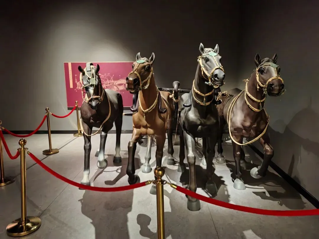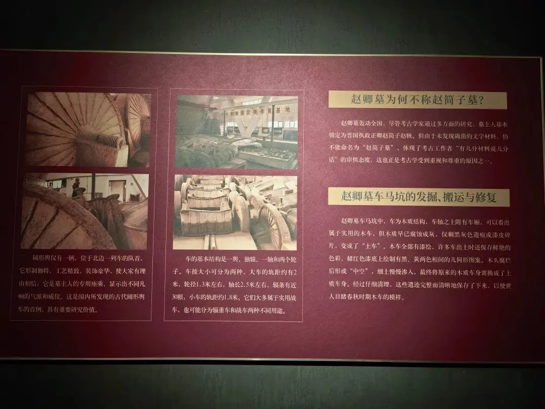 车马坑位于赵卿墓东北7.5米处,呈曲尺形,由马坑和车坑两部分垂直交会而成,东西总长14.8米,南北总长12.6米,面积110平方米。马坑总计葬马46匹,均属蒙古马系。车坑葬车16辆,主要是方舆车,1辆圆舆车。由于坑中设有轮槽,故大部分保留了车的原形,车均“倒置”,车箱着地,车轮悬空。正因为这样与众不同的埋葬方式,使得其得以完整保存下来。虽然木车已成“土车”,但车身的结构关系清楚,荆条绑扎痕迹依然清晰,几乎所有车轮都保持了正圆形,车体一些部位甚至还保留有2000多年之前的漆皮;46匹马体遗骸除个别部位腐朽残缺外,整休状况良好。与省外已经发现的车马坑比较,赵卿墓车马坑的价值在于:车之形态更加完整,其中的一辆圆形舆车,为目前国内之仅见。
