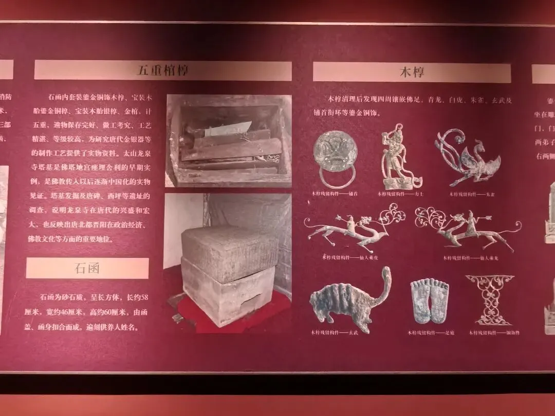 2008年5月8日(农历四月初四),在太山龙泉寺东50米的山前坡地上修建消防蓄水池时,发现了佛塔地宫。塔基依山体而建,平面呈正方形,长宽皆为9.6米,残高1.3米。地宫位于塔基中央,坐北向南,方向195。由甬道、宫门、宫室三部分组成。宫室平面呈六边形,由条石砌筑而成,长97厘米、宽88厘米,内置石函,宫门两侧各塑力士像一尊。