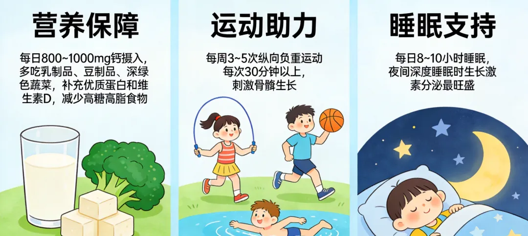 睡眠支持:保证每日8~10小时睡眠,生长激素在夜间深度睡眠时分泌最为旺盛,熬夜会直接影响身高增长潜力。