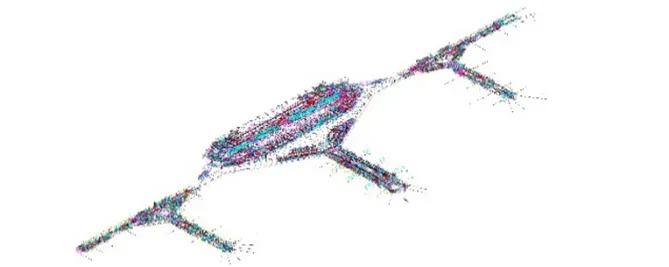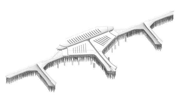 太原武宿国际机场三期改扩建项目T3航站楼位于现有T2航站楼东侧,建筑面积约40万平方米,采用“大港湾+三通道”的三指廊构型。航站楼建筑高度约43.7米(屋面最高点),总长度约1497米,主楼面宽约342米、进深约120米,中指廊长256米、宽50米,东西两侧指廊区竖指廊长约225米、宽约40米。