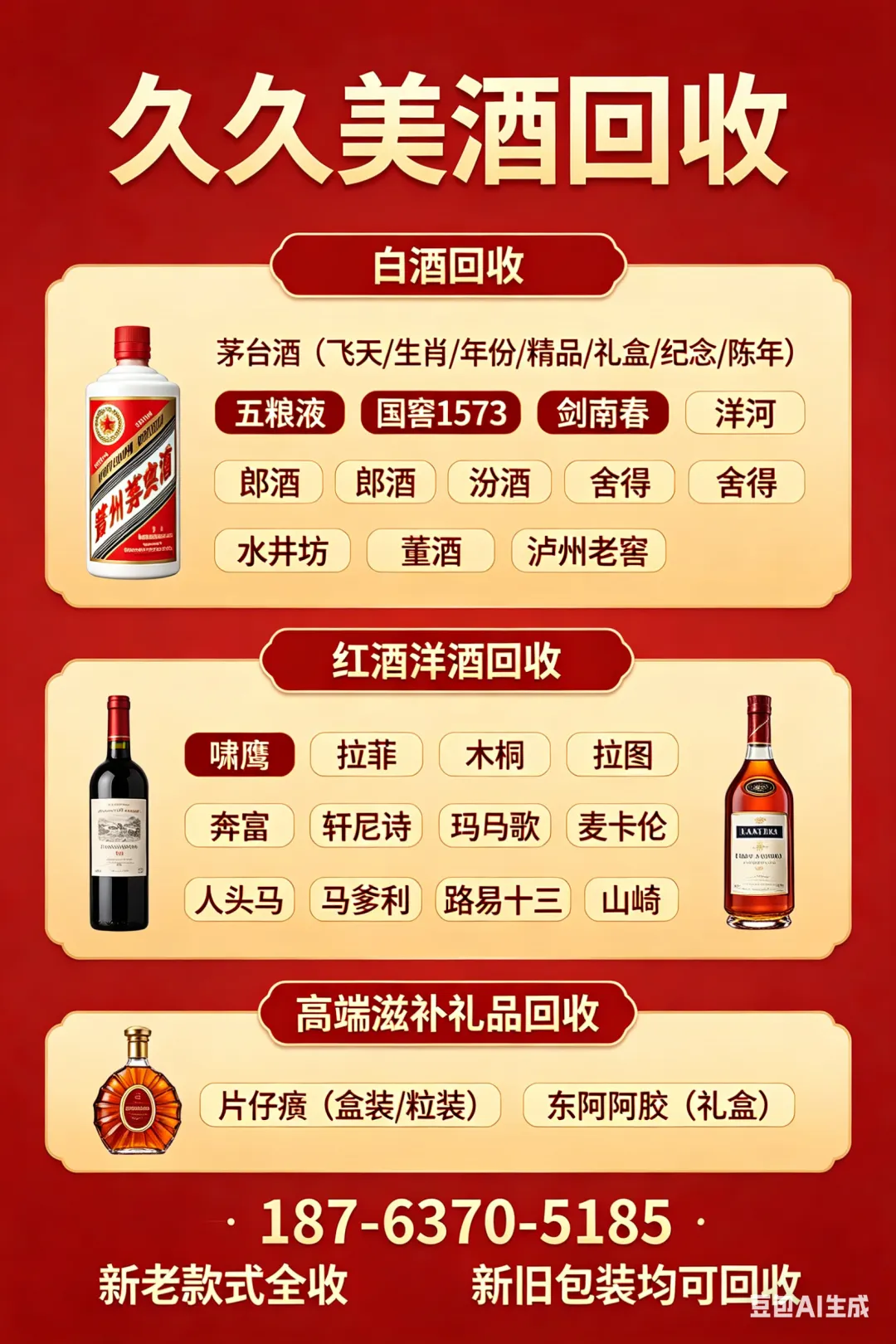 久久美酒回收 联系电话:187-6370-5185(24小时开机,随时接听)主营回收品类:
