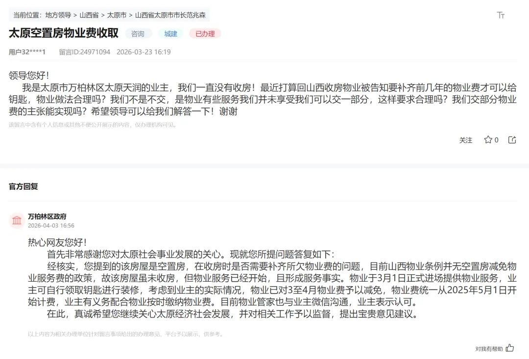 针对这一求助,官方回复中明确指出,您提到的该房屋是空置房,在收房时是否需要补齐所欠物业费的问题,目前山西物业条例并无空置房减免物业服务费的政策,故该房屋虽未收房,但物业服务已经开始,且形成服务事实。物业于3月1日正式进场提供物业服务,业主可自行领取钥匙进行装修,考虑到业主的实际情况,物业已对3至4月物业费予以减免,物业费统一从2025年5月1日开始计费,业主有义务配合物业按时缴纳物业费。目前物业管家也与业主微信沟通,业主表示认可。