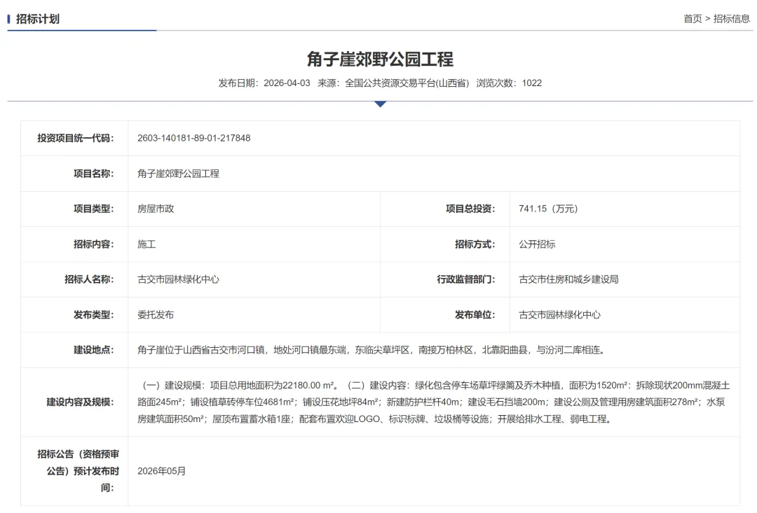 该招标信息由古交市园林绿化中心作为招标人,古交市住房和城乡建设局进行行政监督,项目总投资达741.15万元。招标内容为施工,采用公开招标方式,预计正式的招标公告将于2026年5月发布。