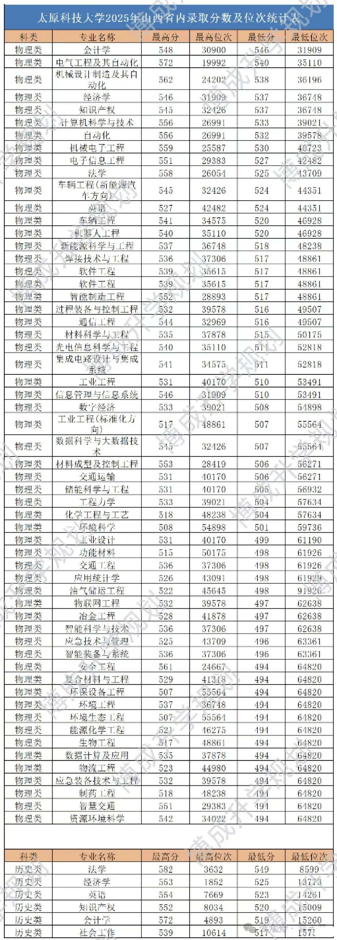 太原科技大学2025年在山西省的录取数据,物理类、历史类各专业的最高分、最低分、位次全都有!这份数据就是2026届考生填报志愿的“风向标”,今天一次性帮你拆透,看看哪个专业是“热门王”,哪个专业能“低分高就”!