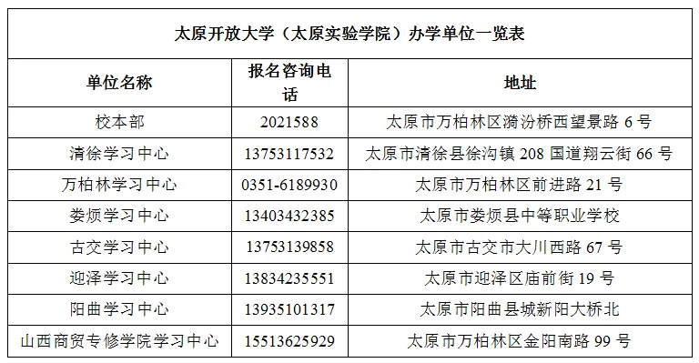 我校不与任何中介机构合作招生,报名人员请到我校设在当地的学习中心和教学点报名。太原地区非太原开放大学公布的学习中心均与太原开放大学没有任何关系,请广大学生维护自身利益,谨防上当受骗。