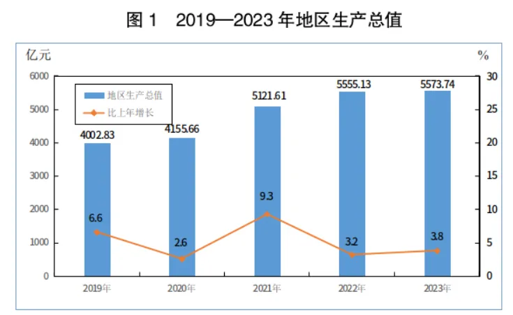 经济增长:初步核算,全市实现地区生产总值(GDP)5573.74亿元,比上年增长3.8%。其中:第一产业增加值45.98亿元,下降3.9%;第二产业增加值2341.68亿元,增长2.2%;第三产业增加值3186.08亿元,增长4.8%。三次产业增加值占地区生产总值的比重为0.8%、42.1%、57.1%,第二产业、第三产业分别拉动经济增0.86和2.98个百分点。人均地区生产总值102370元,按2023年平均汇率计算为14527美元。